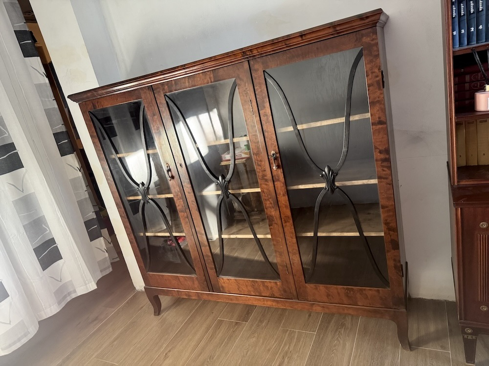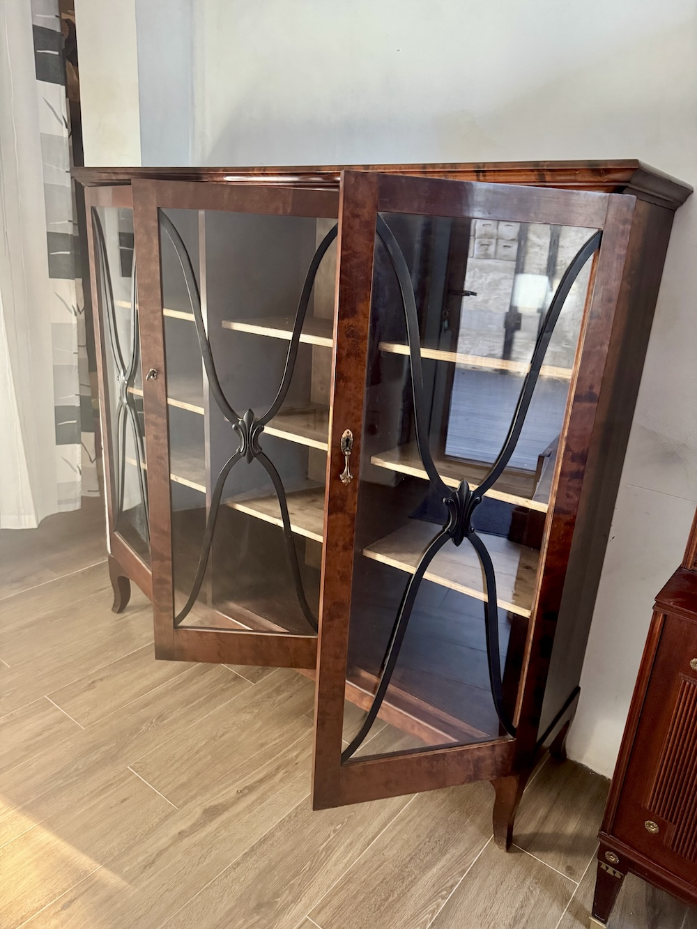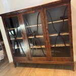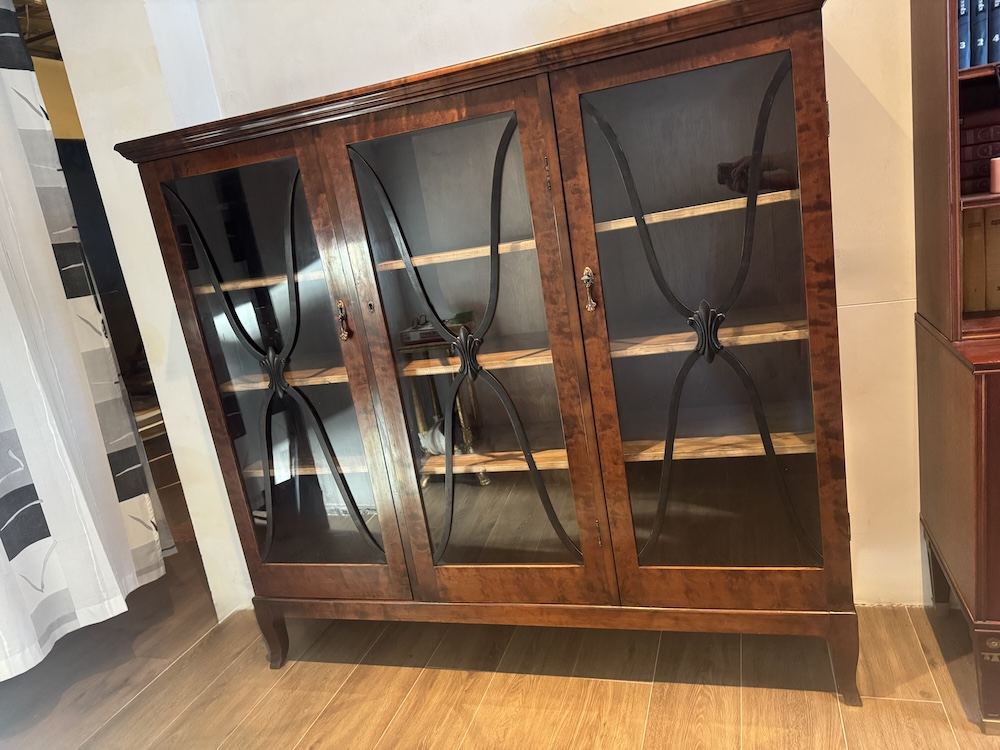 Антикварный книжный шкаф - витрина первой половины 1900-х годов горизонтального типа, редкая древесина пламенной березы, лаконичный дизайн с витражным остеклением. Высота 139 см, ширина 152 см, глубина 43 см