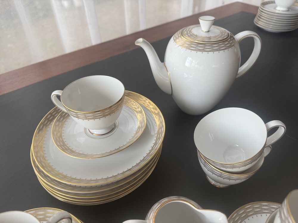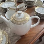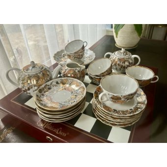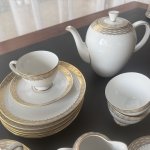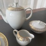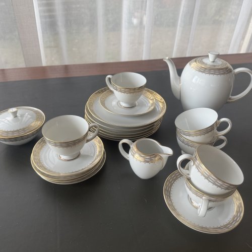 Кофейный фарфоровый сервиз на 6 персон (чашка , блюдце и пирожковая тарелка) с сахарницей, молочником и чайником. Элегантный сервиз с обширной позолотой, тонкостенный, белоснежный костяной фарфор прекрасного качества, Германия. Отличное состояние.