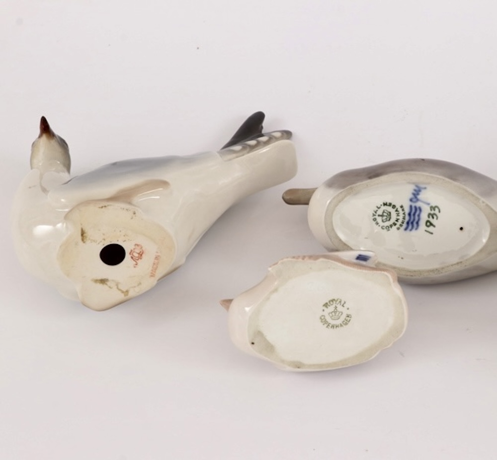 Коллекция фарфоровых фигурок птиц , состоящея из Чайки ЛФЗ (Ломоносовский фарфоровый завод) , птенца индюшки и плывущего селезня Royal Copenhagen Дания. Высота 15- 5 см, без сколов трещин и реставрации. Цена указана за одну фигурку.