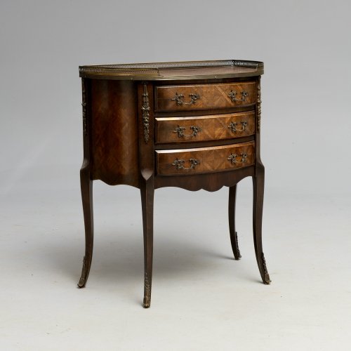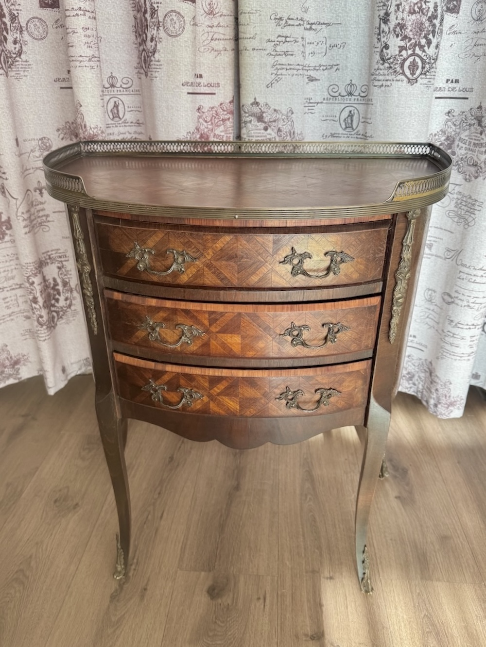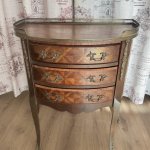 Комод в французском стиле Людовика XV, можно использовать для установки настольных ламп, как приставную тумбочку, для декоративных ваз и прочих интерьерных аксессуаров) середина 1900-х годов, с маркетри, с латунным ажурным бортиком и ручками, 3 выдвижных ящика, конические ножки с латунными накладками. Ширина около 62 см, глубина 36 см и высота 72 см.