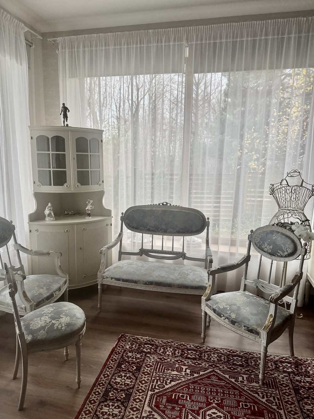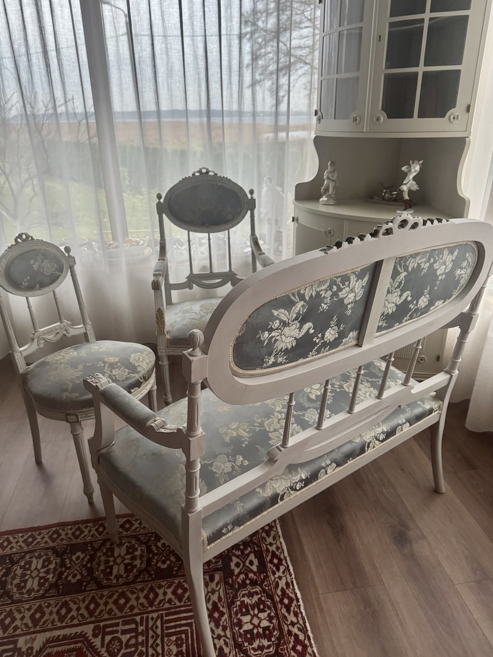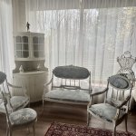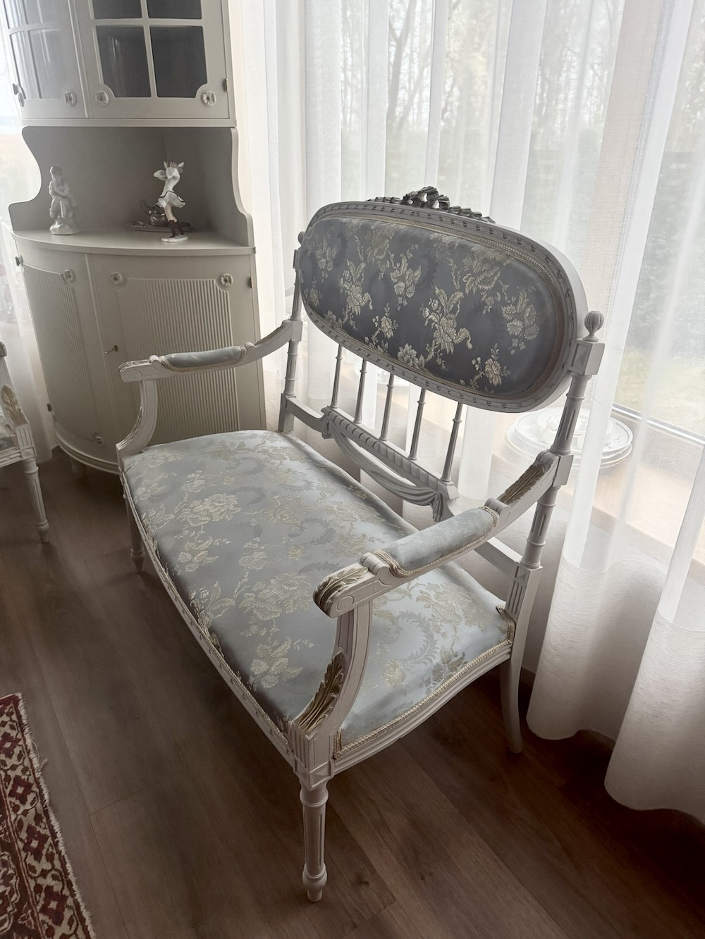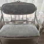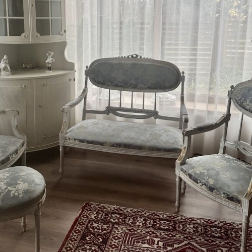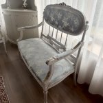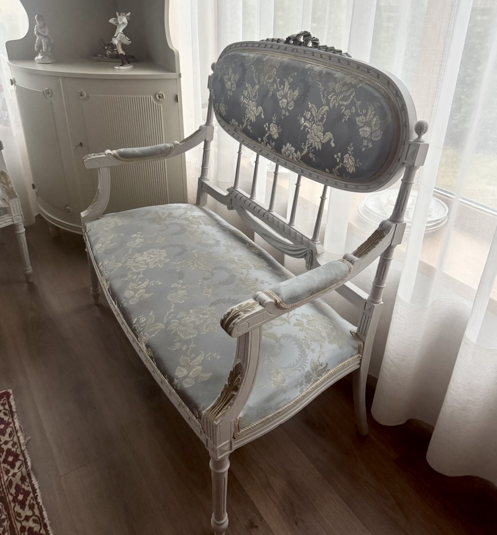 Компактная эффектная комфортная софа в густавианском стиле, с прекрасной резьбой и точеными ножками, атласная обивка, твердая древесина. Длина около 105 см, ширина 60 см, высота около 102 см, высота сидения 42 см.