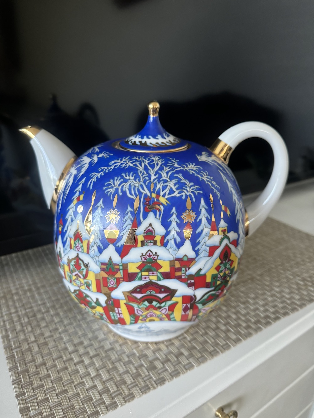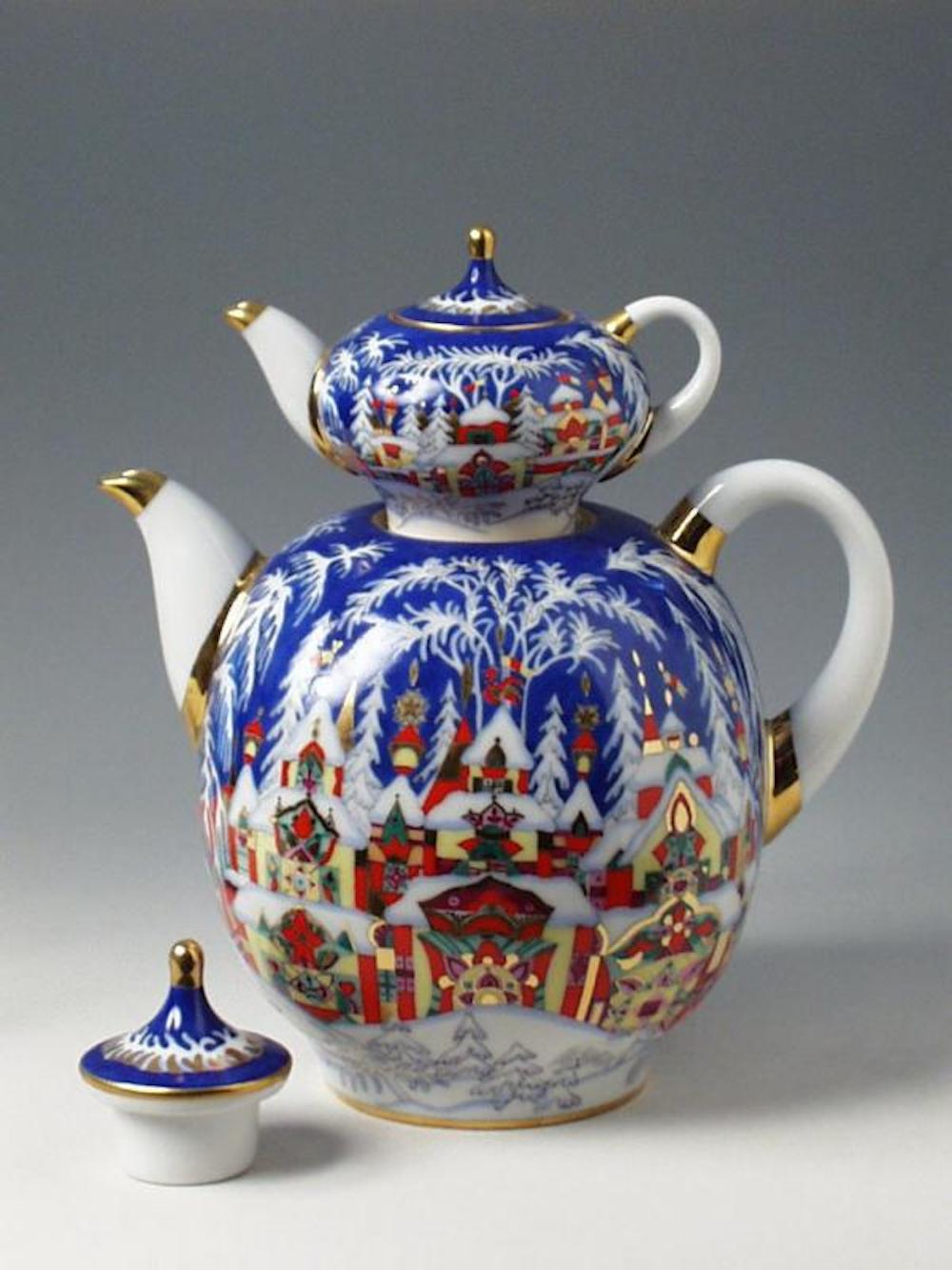 Viens no retākajiem un iekārojamākajiem 2 tējkannu komplektiem "Ziemas pasaka" pēc slavenā Lomonosova porcelāna fabrikas mākslinieka A. Vorobjovska zīmējuma, (tējkanna un liela apjoma papildināma tējkanna) no 20. gadsimta 00. gadu beigām ar zīmi "Ražots Krievijā". Augstums 21 cm un 10 cm, tilpums 2450 ml un 250 ml, ar rokām apgleznoti ar 22 karātu zeltu. Bez šķembām vai restaurācijas, lieliskā stāvoklī.