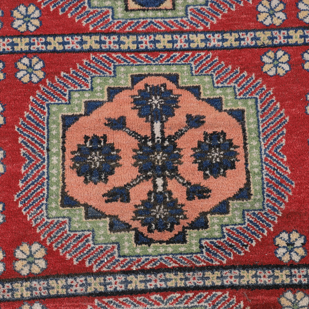 Antīks austrumniecisks no vilnas ar biezu kaudzi, ar rokām austs, ar labu nemazgātu kaudzi, istabas izmērs, 200x148 cm. Tagad ļoti populāri ir antīkie dabīgie paklāji ar ģeometrisku rakstu un dabīgām krāsvielām, kas ne tikai lieliski iederas modernā un klasiskā interjerā, bet arī rada mājīgumu un ir ļoti ērti. Dizaineri no visas pasaules labprāt izmanto šādus paklājus interjerā.