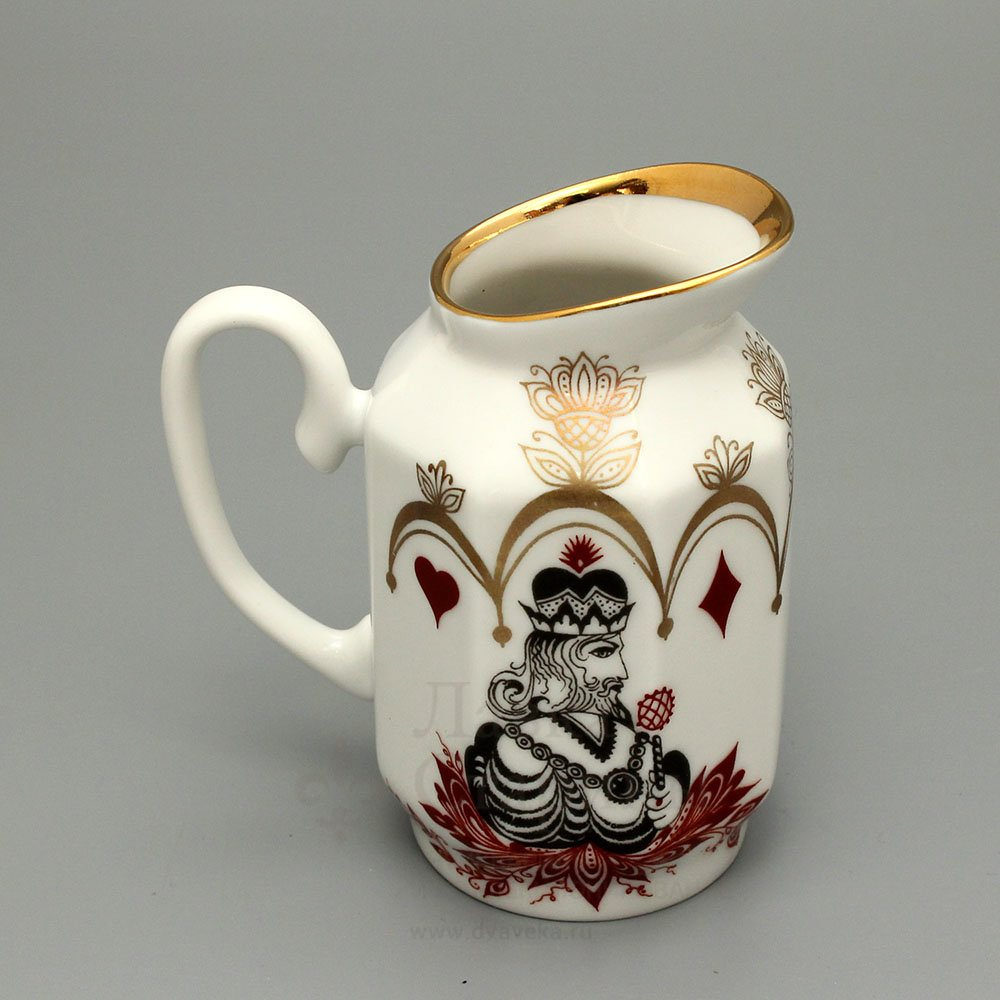 Lomonosova porcelāna fabrikas "Spēle" kafijas servīze (Kartes) 4 personām, tajā skaitā kafijas kanna 24 cm augsta, piena kanna, svečturis un konfekšu bļoda (cukurtrauks) uz kājas. Serviss ir dekorēts ar kāršu spēļu sižetiem, zeltījumu. Marķējums "Ražots PSRS" (eksporta versija), teicamā stāvoklī. Pakalpojums ir ārkārtīgi rets un skaists, lieliskā stāvoklī. Autors N. P. Slavina, 1988.