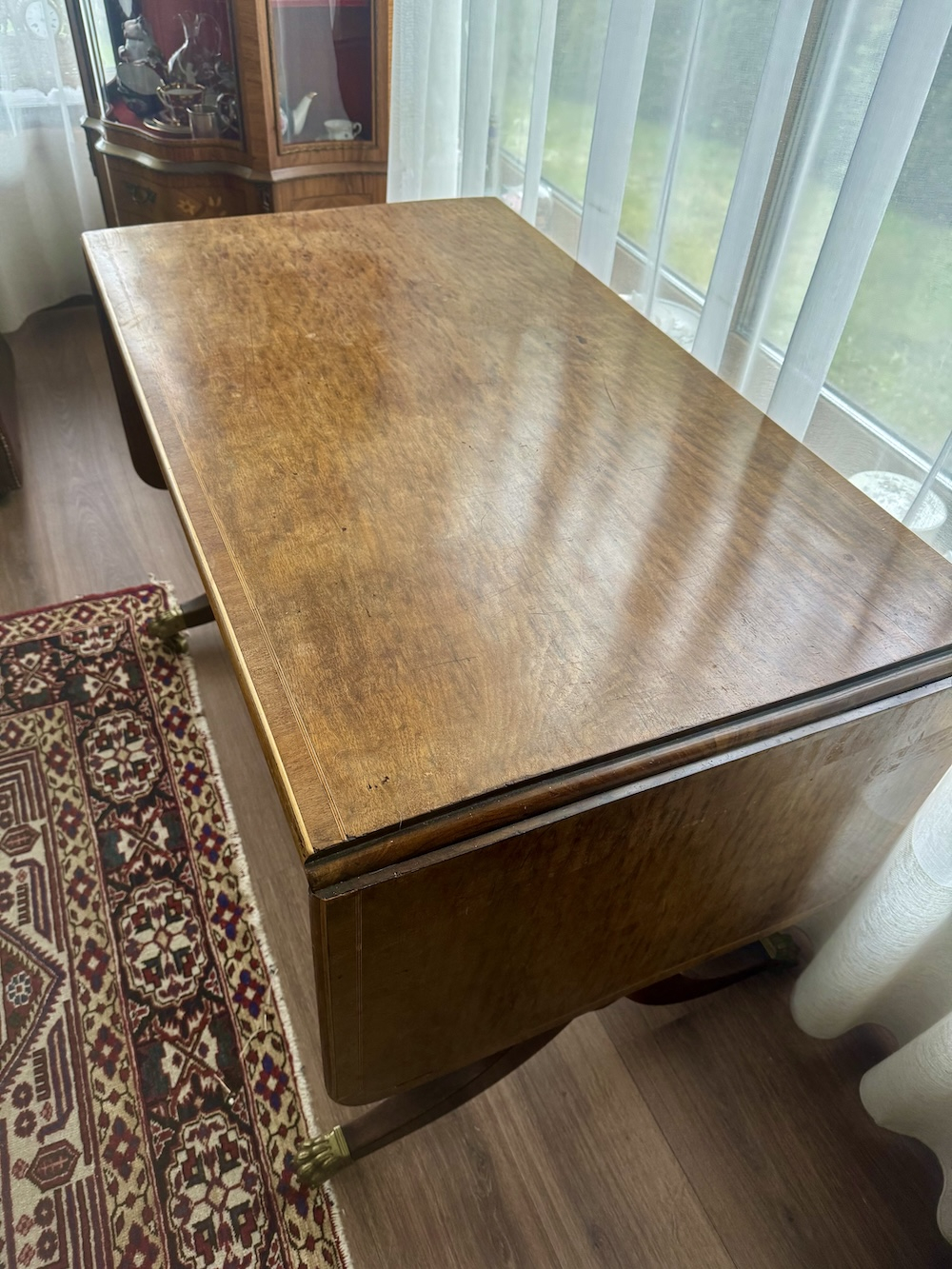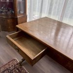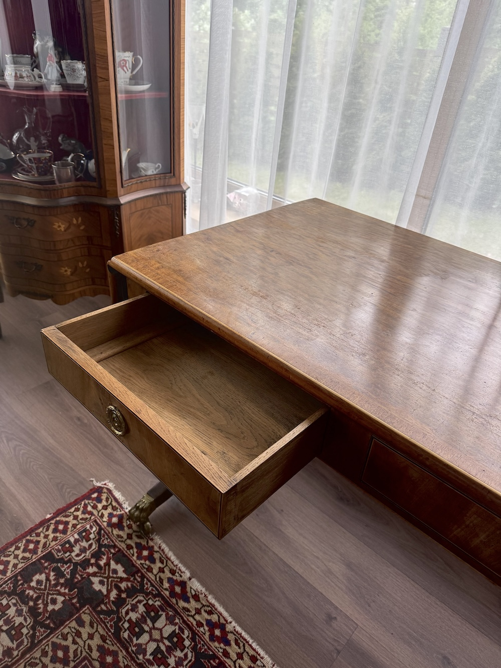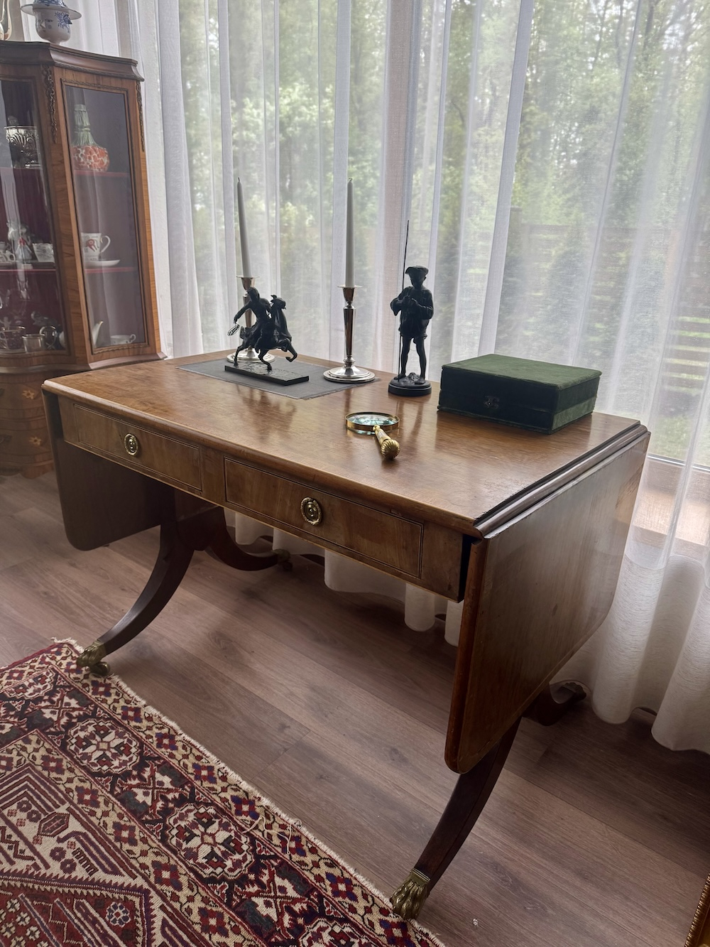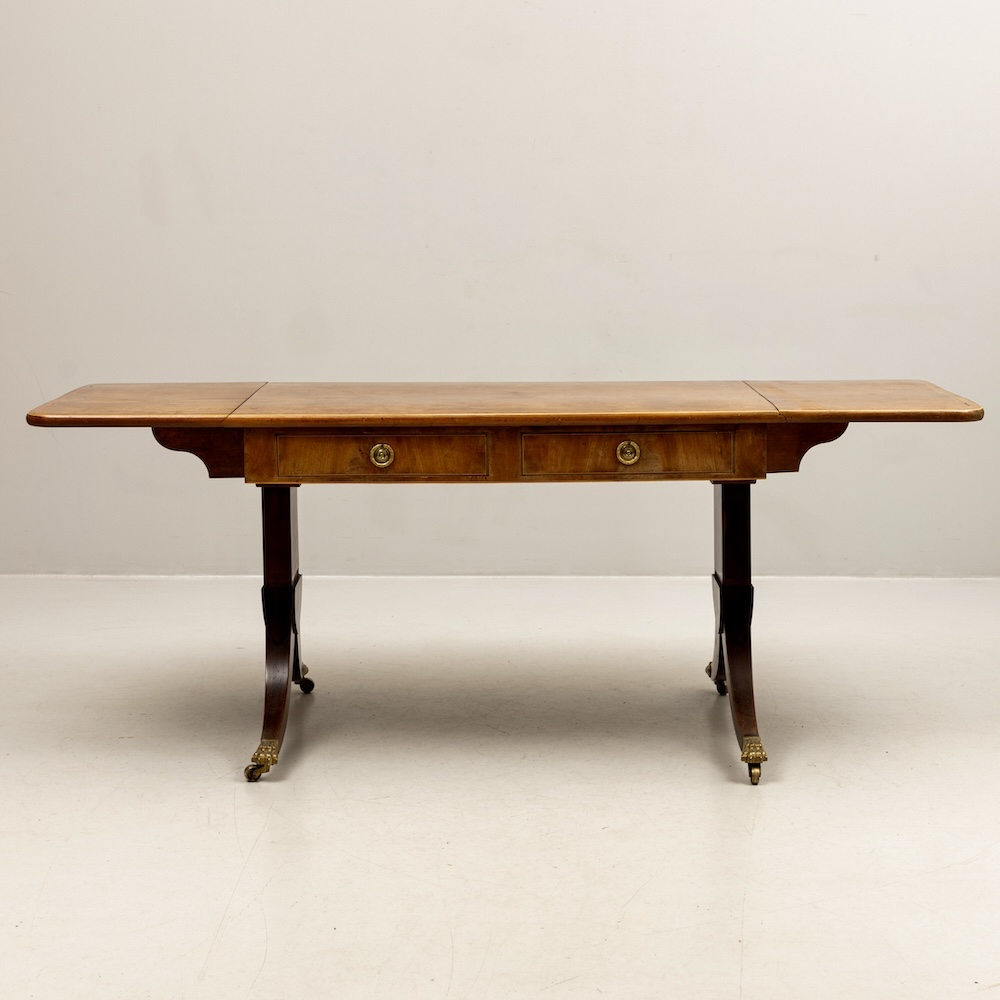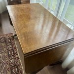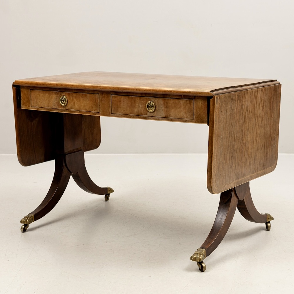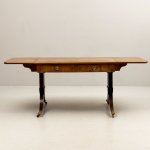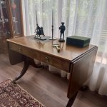 Antīks angļu rakstāmgalds uz riteņiem ar 2 atvilktnēm vienā pusē un imitācijas atvilktnēm otrā pusē, kas ļauj galdu novietot ne tikai pie sienas. Misiņa furnitūra, bronzas ķepas formas kājas, 20. gadsimta sākums, izturīgas un labi izgatavotas. Augstums apm. 77 cm, garums apm. 115 cm + 43 cm + 43 cm, platums 65 cm.