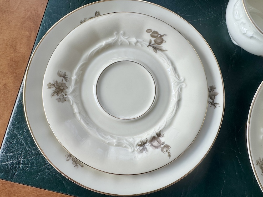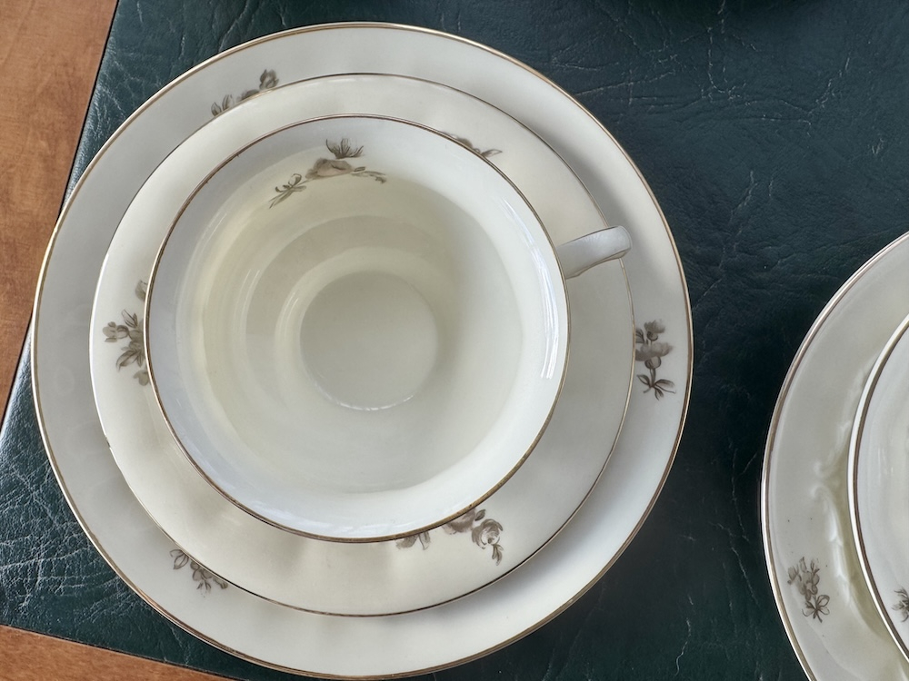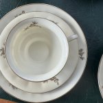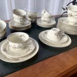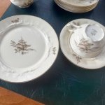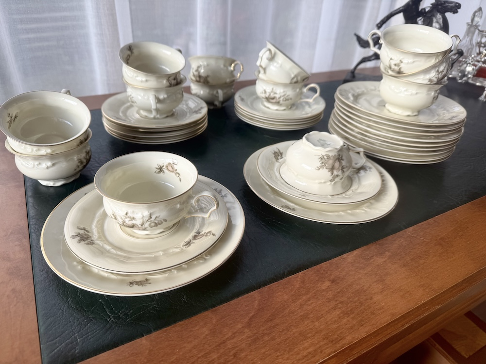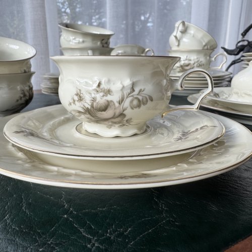Sērija: "Pompadour" — klasiska Rosenthal sērija, kas izgatavota no caurspīdīga porcelāna ar izsmalcinātu dizainu. Pieejami vienpadsmit pilni trio, kā arī viens tējas komplekts. Krūzes tilpums: 150 ml, apakštasītes un šķīvja diametrs 14,5+18 cm. Cena ir par vienu trio.