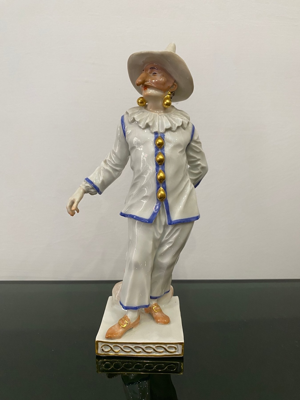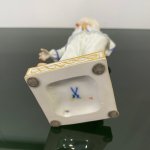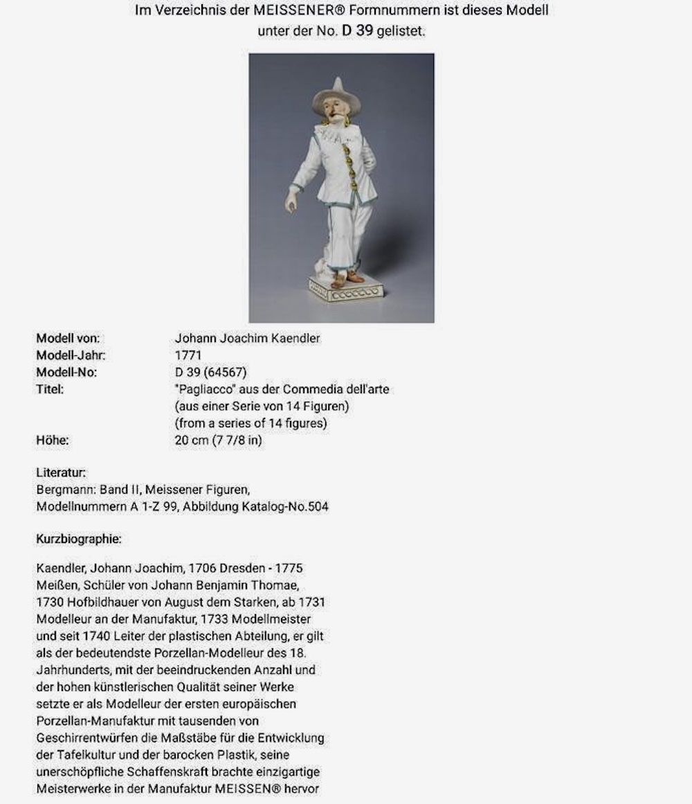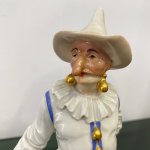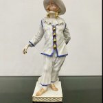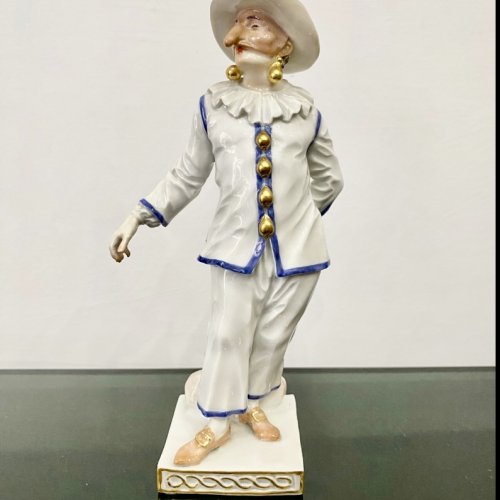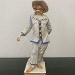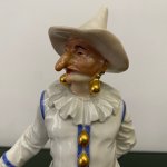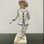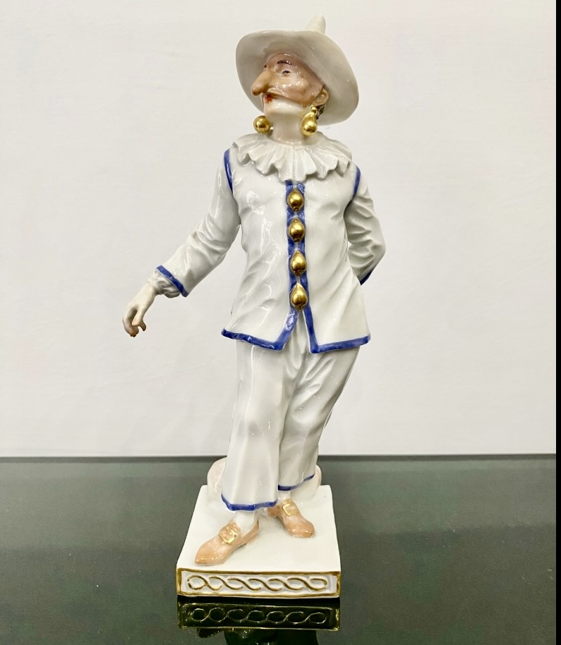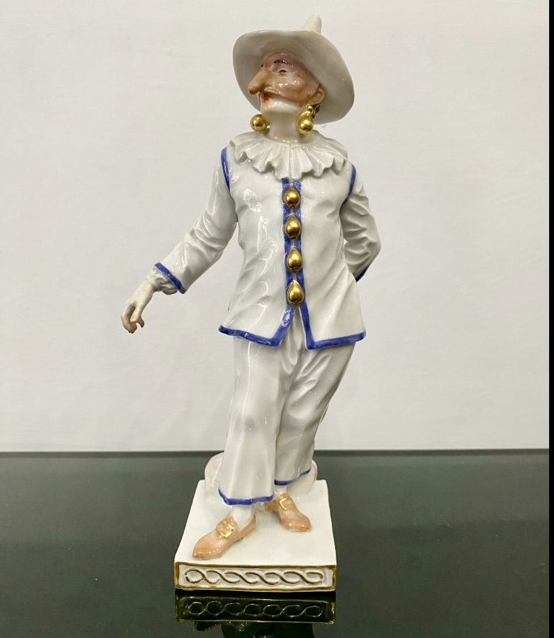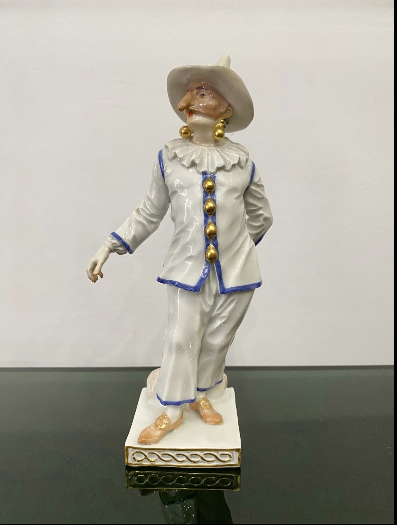 Великолепная фарфоровая статуэтка Пальяццо мануфактуры Meissen из серии "Комедия дель арте ", или, как ее ещё называют, " Комедия масок ". Созданные Кендлером в конце 30х годов 18 века фигурки отражали уличный театр итальянского Возрождения . Модель № 64567, расписанная вручную, изображает Пальяччо (Пальяццо), который является одним из основных героев Комедии Дель Арте, и входит в любовный треугольник – Арлекин-Коломбина-Пальяччо. Это добрый и отзывчивый персонаж, постоянно попадающий в забавные ситуации. Высота фигурки 19 см, без сколов, трещин и реставрации, в прекрасном состоянии.