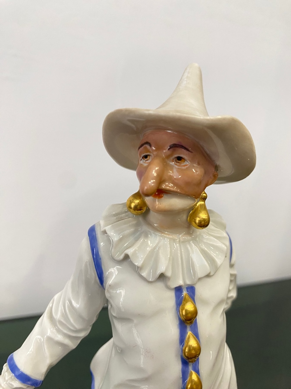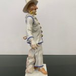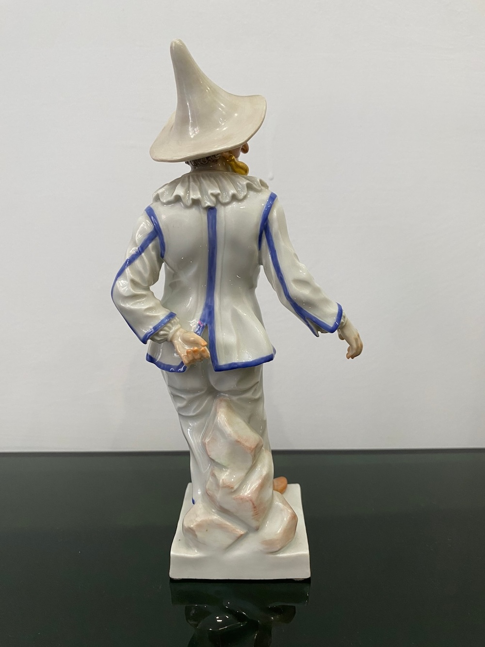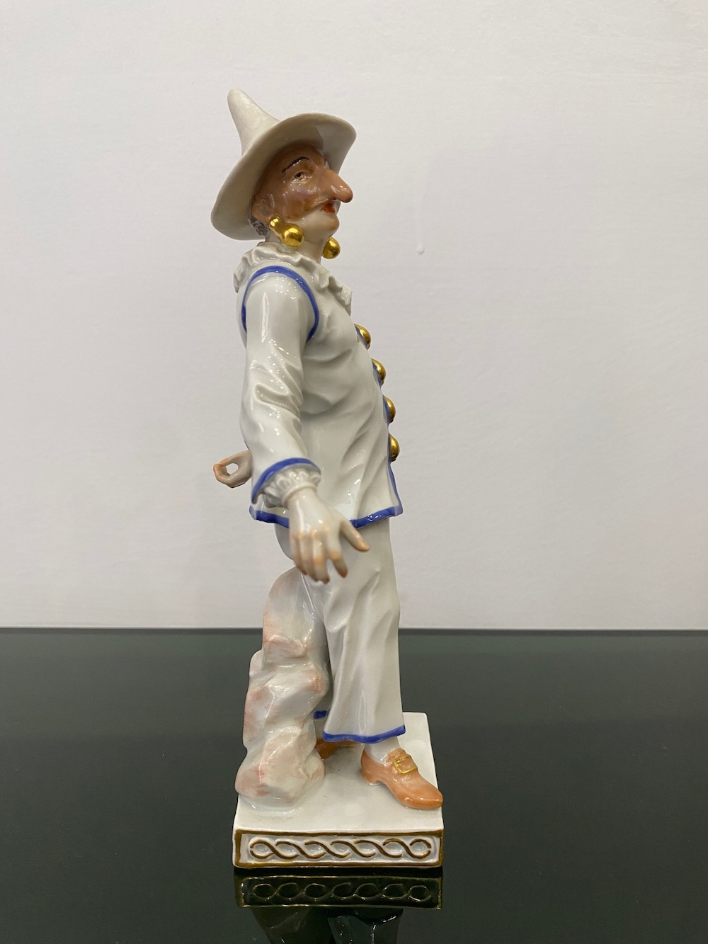 Великолепная фарфоровая статуэтка Пальяццо мануфактуры Meissen из серии "Комедия дель арте ", или, как ее ещё называют, " Комедия масок ". Созданные Кендлером в конце 30х годов 18 века фигурки отражали уличный театр итальянского Возрождения . Модель № 64567, расписанная вручную, изображает Пальяччо (Пальяццо), который является одним из основных героев Комедии Дель Арте, и входит в любовный треугольник – Арлекин-Коломбина-Пальяччо. Это добрый и отзывчивый персонаж, постоянно попадающий в забавные ситуации. Высота фигурки 19 см, без сколов, трещин и реставрации, в прекрасном состоянии.