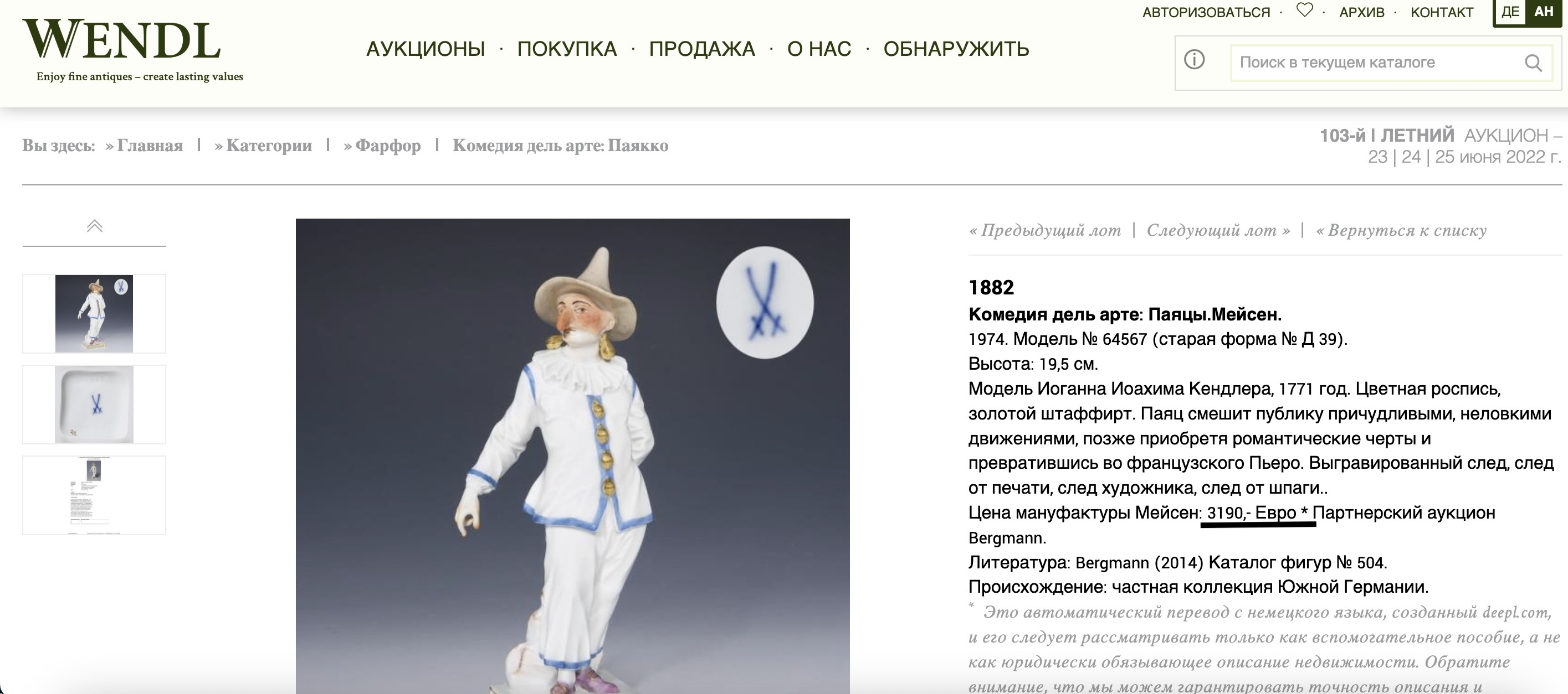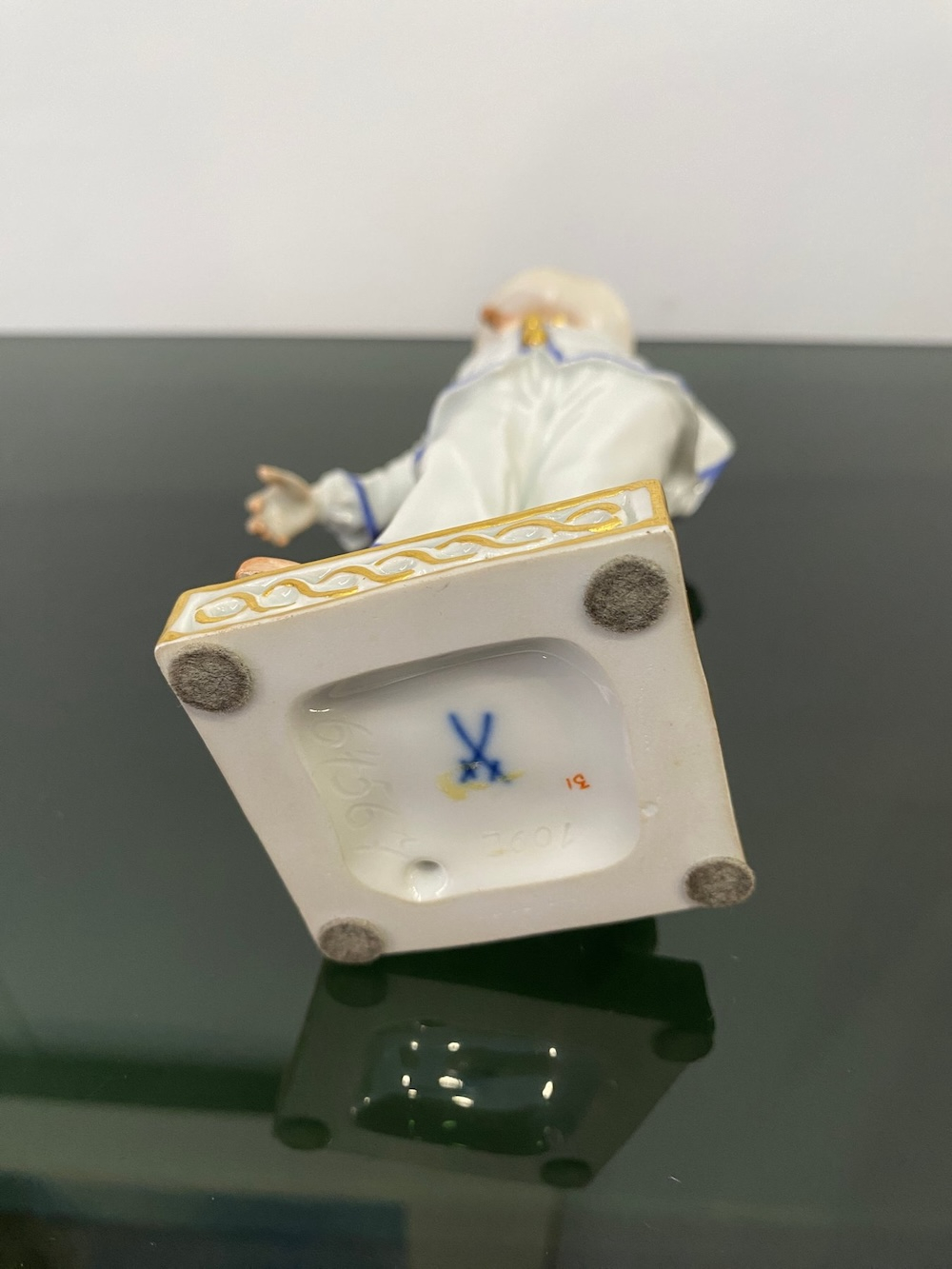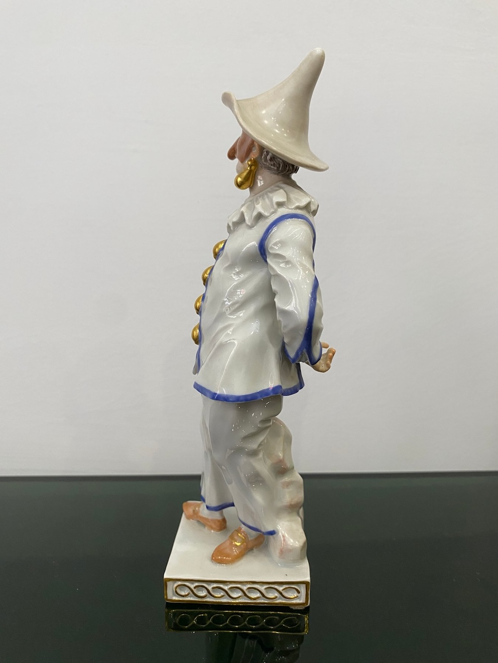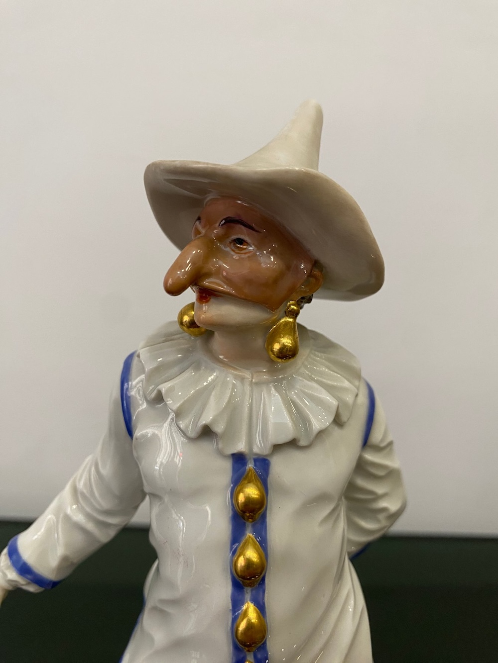 Великолепная фарфоровая статуэтка Пальяццо мануфактуры Meissen из серии "Комедия дель арте ", или, как ее ещё называют, " Комедия масок ". Созданные Кендлером в конце 30х годов 18 века фигурки отражали уличный театр итальянского Возрождения . Модель № 64567, расписанная вручную, изображает Пальяччо (Пальяццо), который является одним из основных героев Комедии Дель Арте, и входит в любовный треугольник – Арлекин-Коломбина-Пальяччо. Это добрый и отзывчивый персонаж, постоянно попадающий в забавные ситуации. Высота фигурки 19 см, без сколов, трещин и реставрации, в прекрасном состоянии.