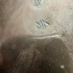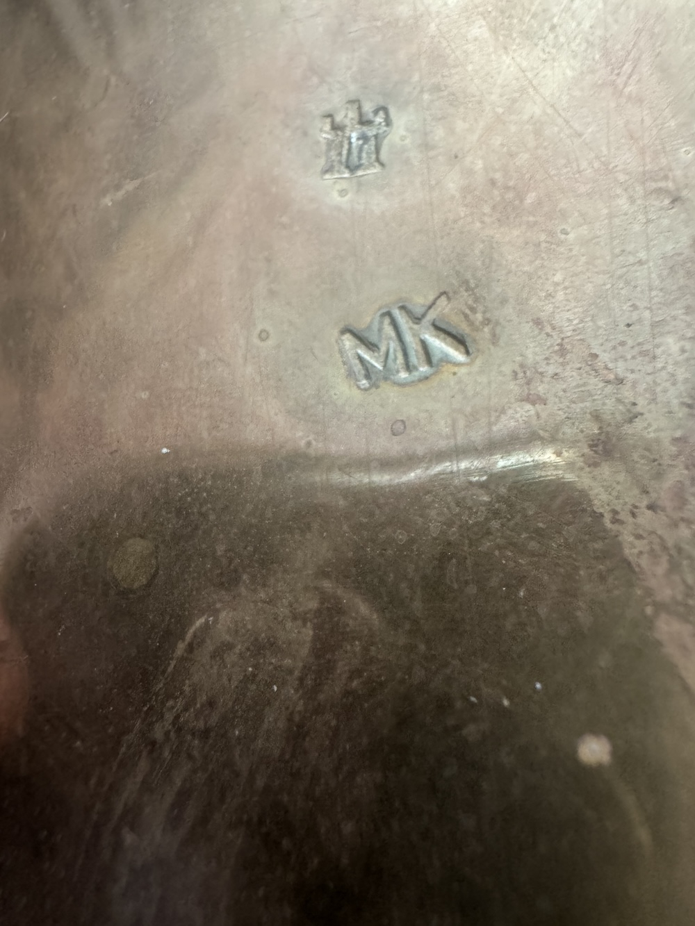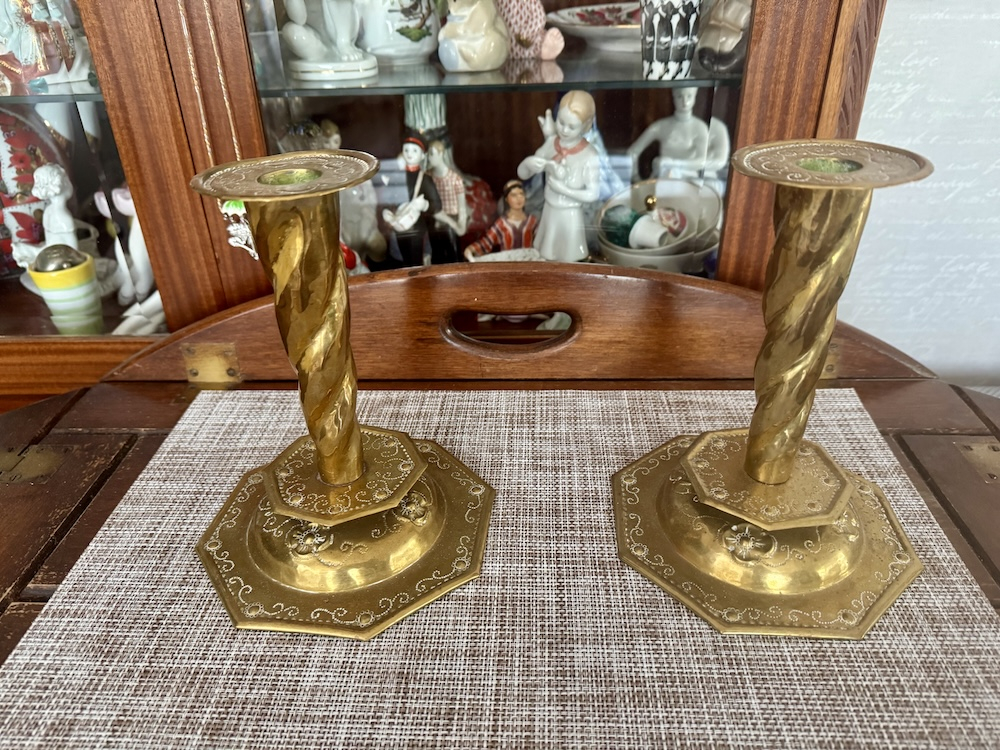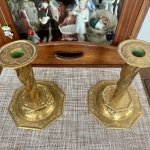 Пара антикварных подсвечников из латуни , восьмиугольной формы, с рельефным изображением фруктов на куполообразном основании под спиральными колоннами (высота 25 см). На основании клеймо башни и буквы МК. Хорошее состояние. Цена за пару