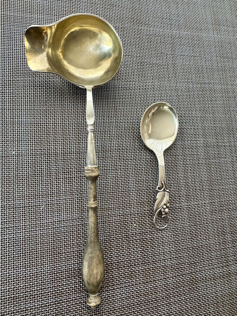Пара антикварных столовых предметов из серебра 830 пробы в виде раритетного серебряного ковша - половника и соответствующей ему серебряной ложки. На ковше и ложке шведские клейма серебра и годовые обозначения, соответствующее у ковшика 1859 году , ложка- 1939 года. Длина 21 см и 11 см соответственно, вес ковшика 35 грамм, общий вес 48 грамм, хорошее состояние для антикварных предметов одному из которых более 160 лет.