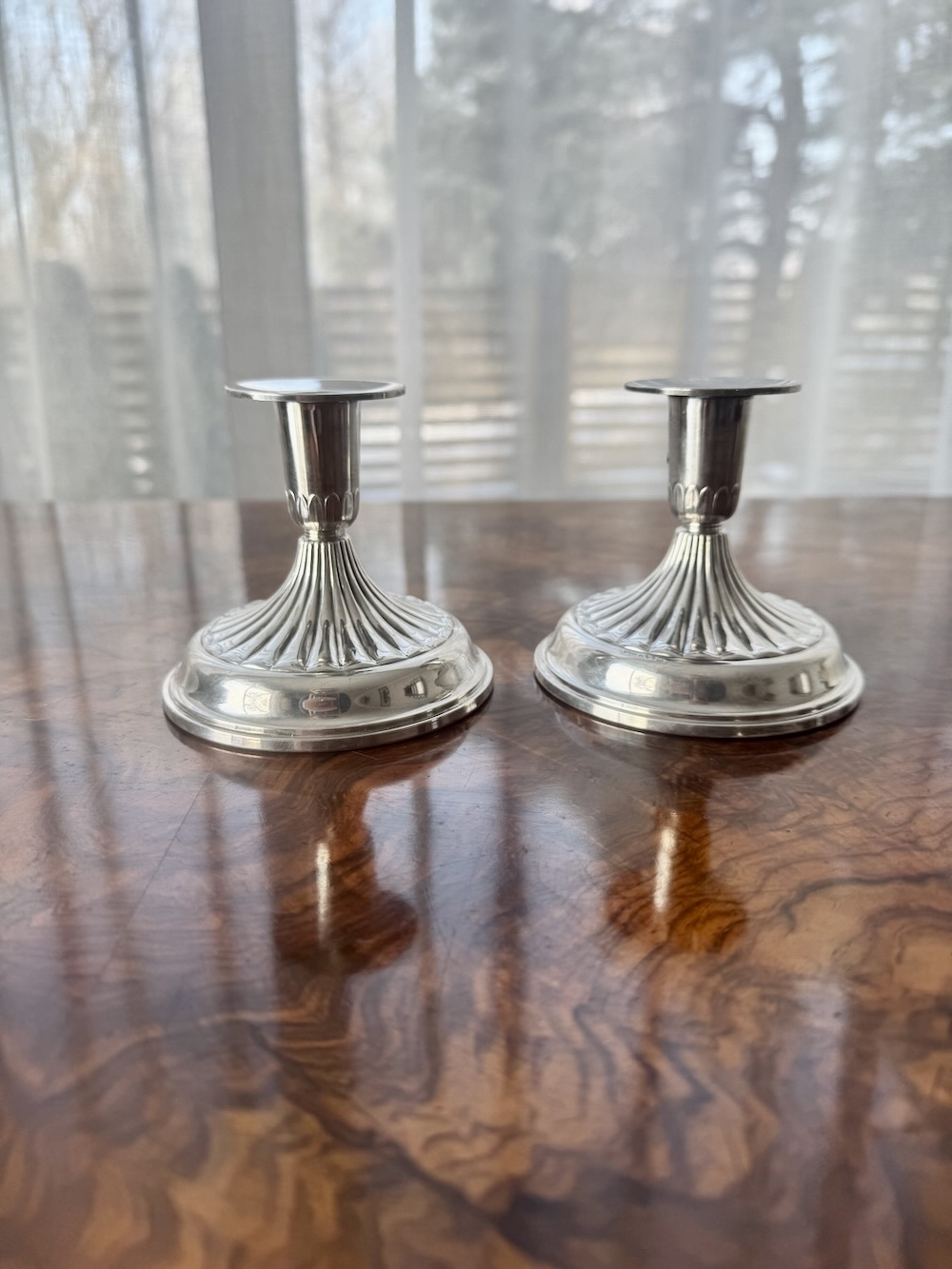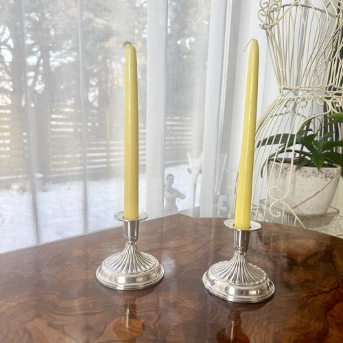 Пара серебряных подсвечника 830 пробы с рельефным изящным декором, четкие шведские клейма серебра 1945 года, высота 8 см. Общий вес брутто 386 грамм. Украсит праздничный стол, прекрасный подарок .