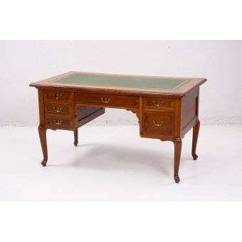 Письменный стол в английском стиле, лаконичный и удобный, с тремя выдвижными ящиками, столешница обтянута кожей, ручки из латуни. Размеры: 122 х 62 см, высота 75 см. (Nr.21-92 inv)