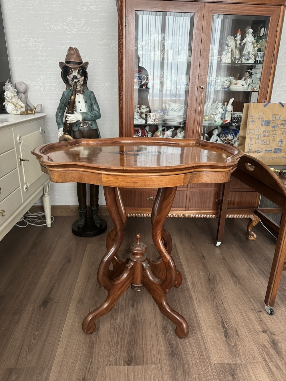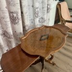 Прекрасный столик с выдвижными дисками с 2 сторон , красное дерево и орех с красивым и сложным декором интарсия. В стиле неорококо. Высота 75 см, ширина 77 см, глубина 57 см.