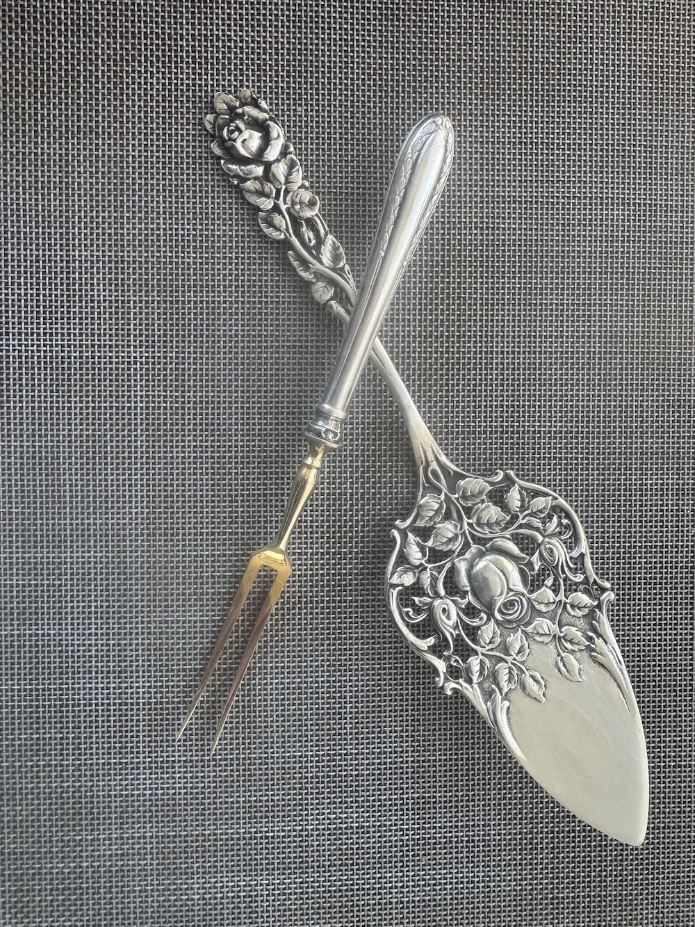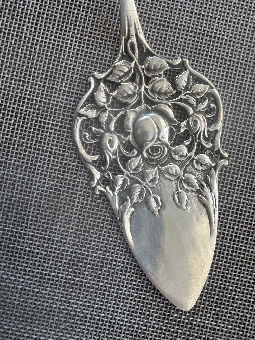 Прекрасный набор для чаепития - старинная серебряная лопаточка для торта , серебро 830 пробы, Швеция, 1955 год , клеймо, вес около 55 г, длина . Красивый ажурный декор, увенчанный хильдесхаймской розой , символом неумирающей жизненной силы