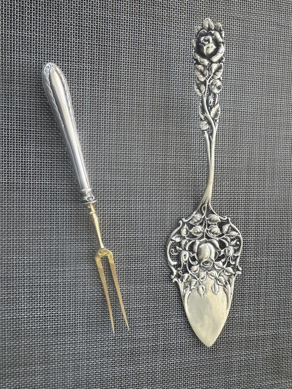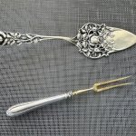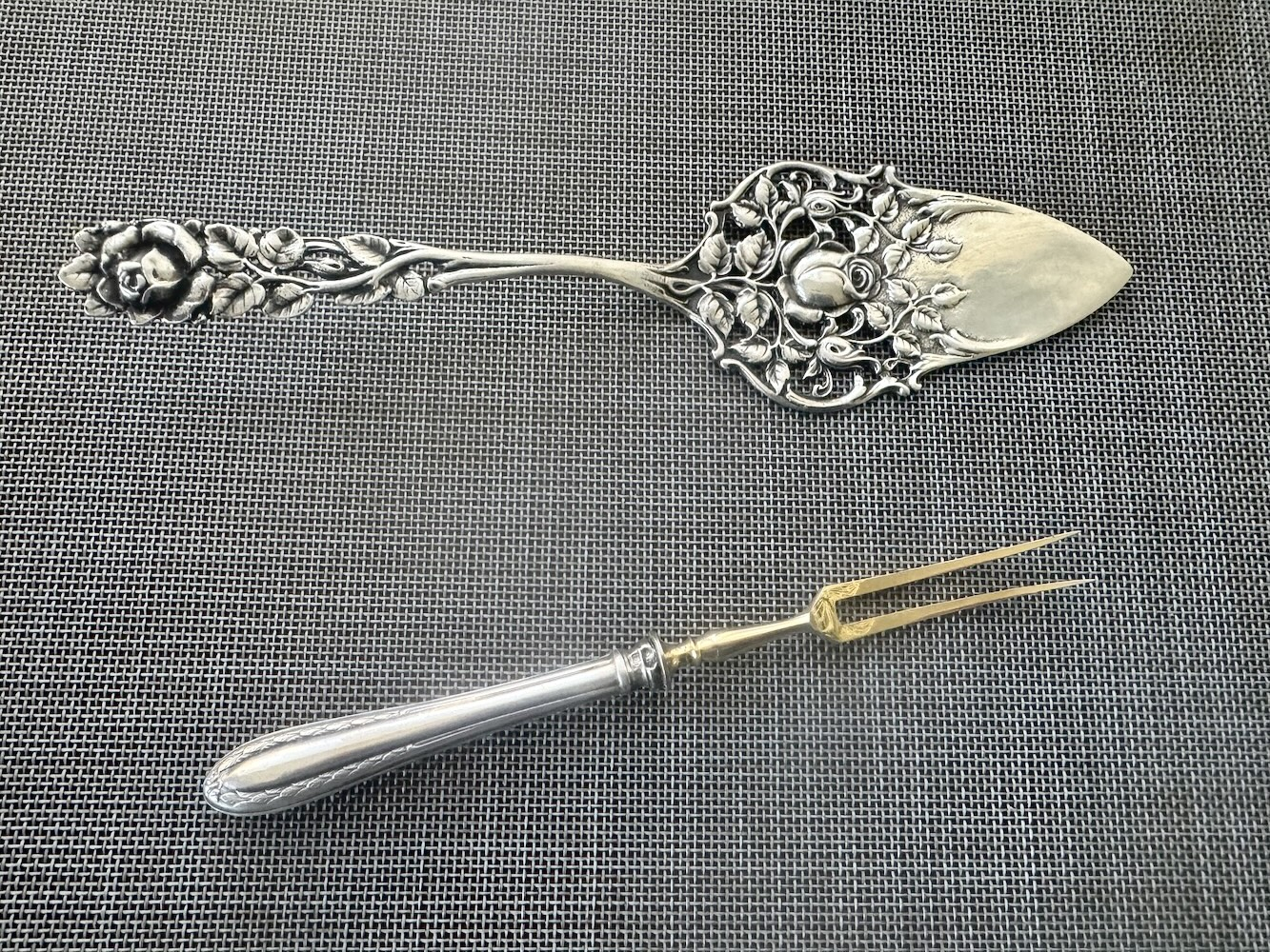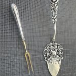 Длина: 21,5 см. Также вилочка для лимона с серебряной рукояткой 875 пробы, Латвия, вес 30 грамм, длина 17,5 см, 1950-1960 годы.
