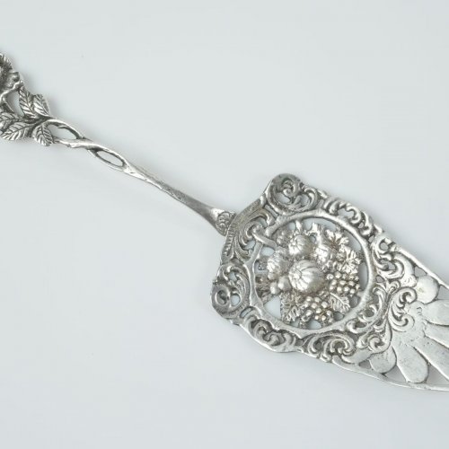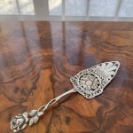 Старинная серебряная лопаточка для торта , Gewe, Швеция, 1947, серебро 830 пробы, клеймо, около 45,54 г. Красивый ажурный декор, увенчанный хильдесхаймской розой , символом неумирающей жизненной силы