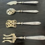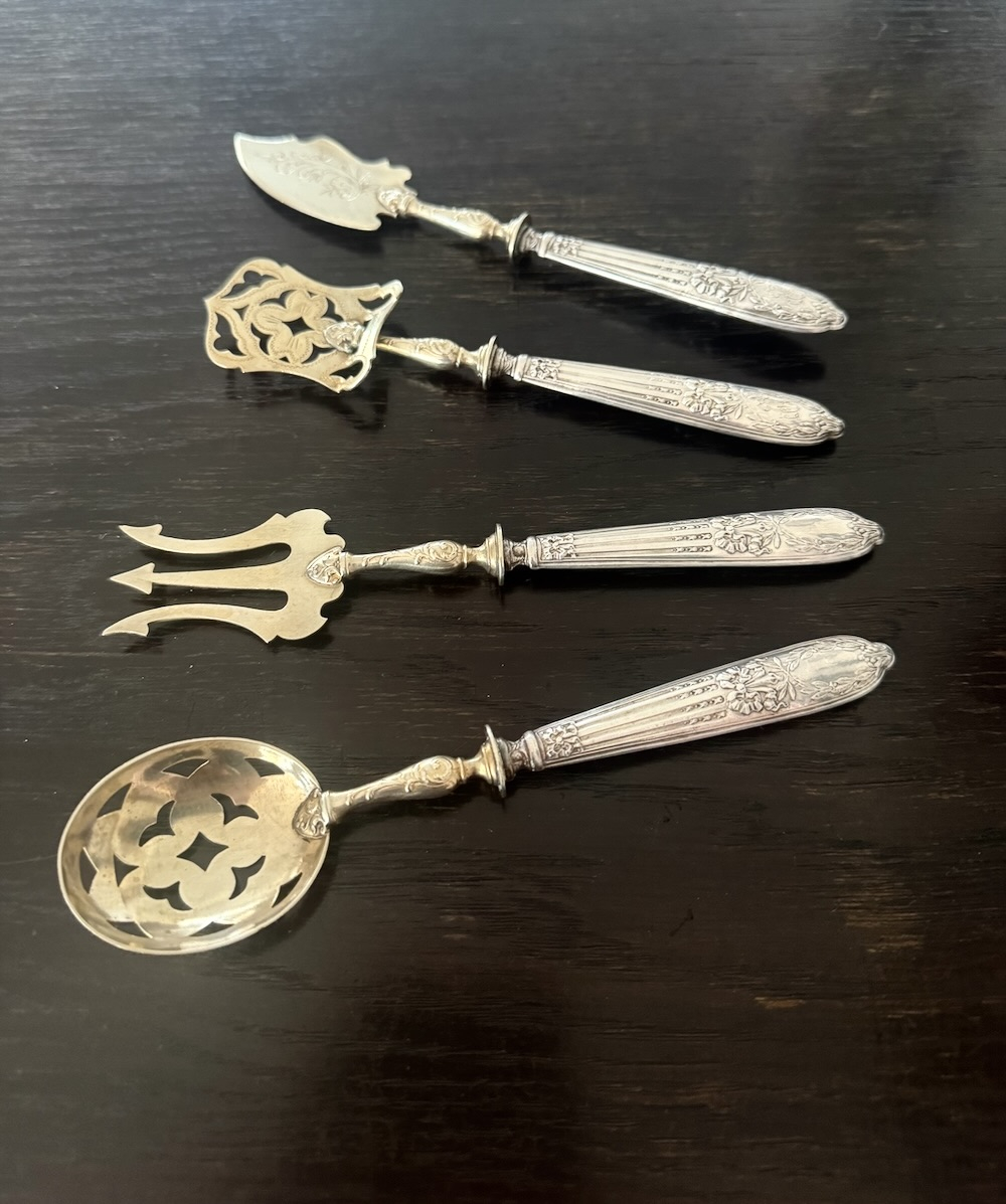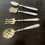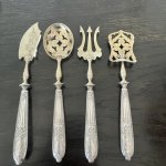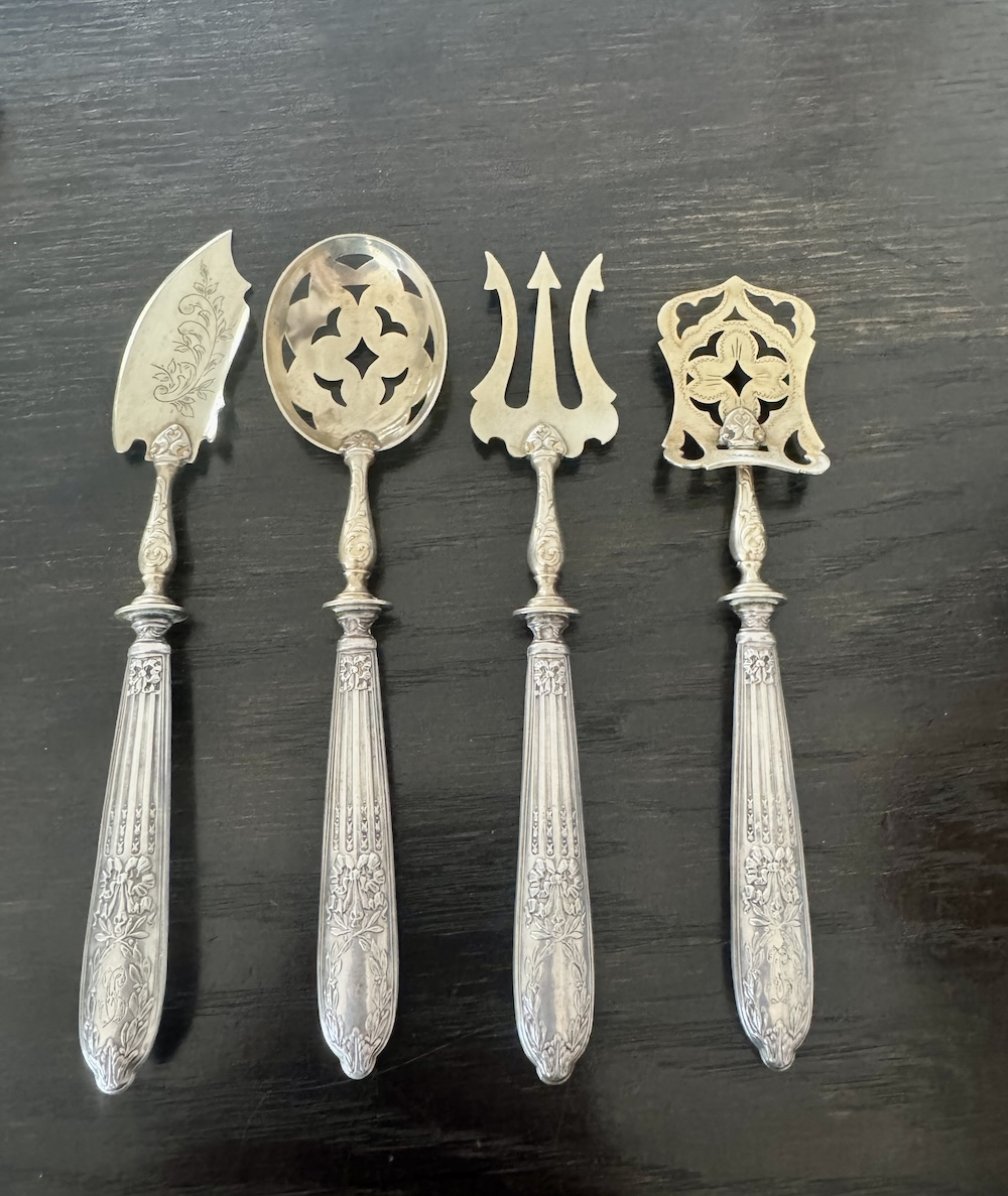 В наборе: вилка для шпрот или сардин, нож для масла, паштета, лопаточка для сыра или фуа гра, а также ложка для оливок. Это красивый экземпляр представляет собой подлинную французскую старину для изысканной сервировки стола.