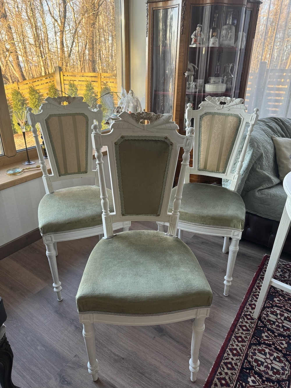 Антикварный комплект, состоящий из великолепного стола с медальонами и 3 легких и изящных стульев в бело-зеленой гамме начала 1900-х годов, полностью из древесины, с вырезанным вручную декором, в хорошем состоянии. Высота cтола 75 см, диаметр 75 см. Можно частями.