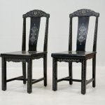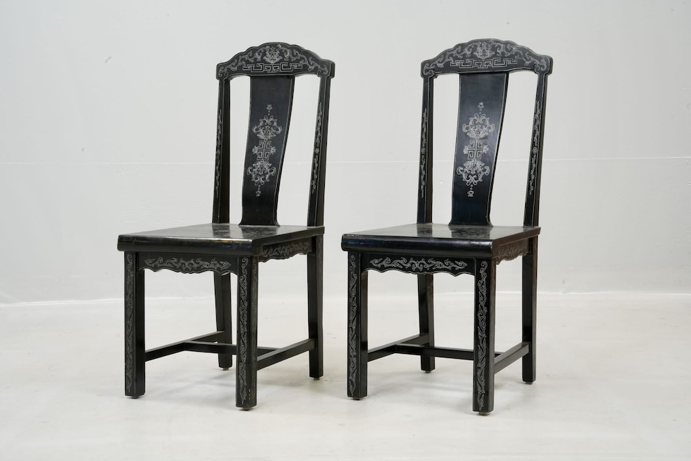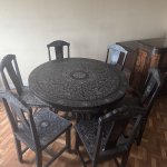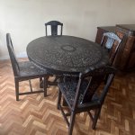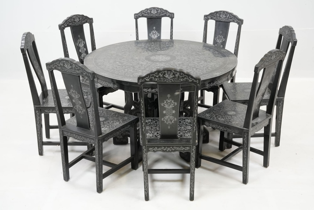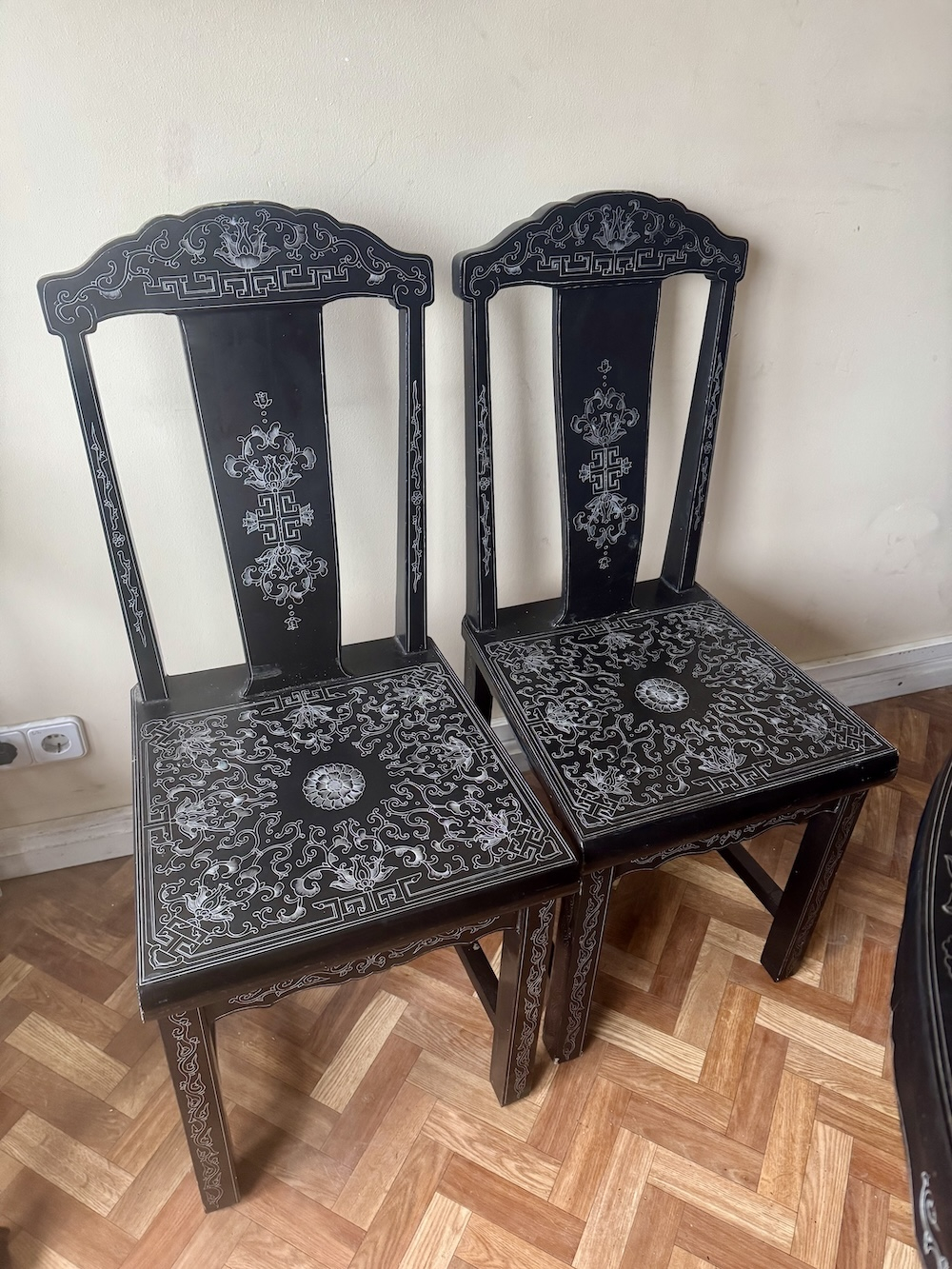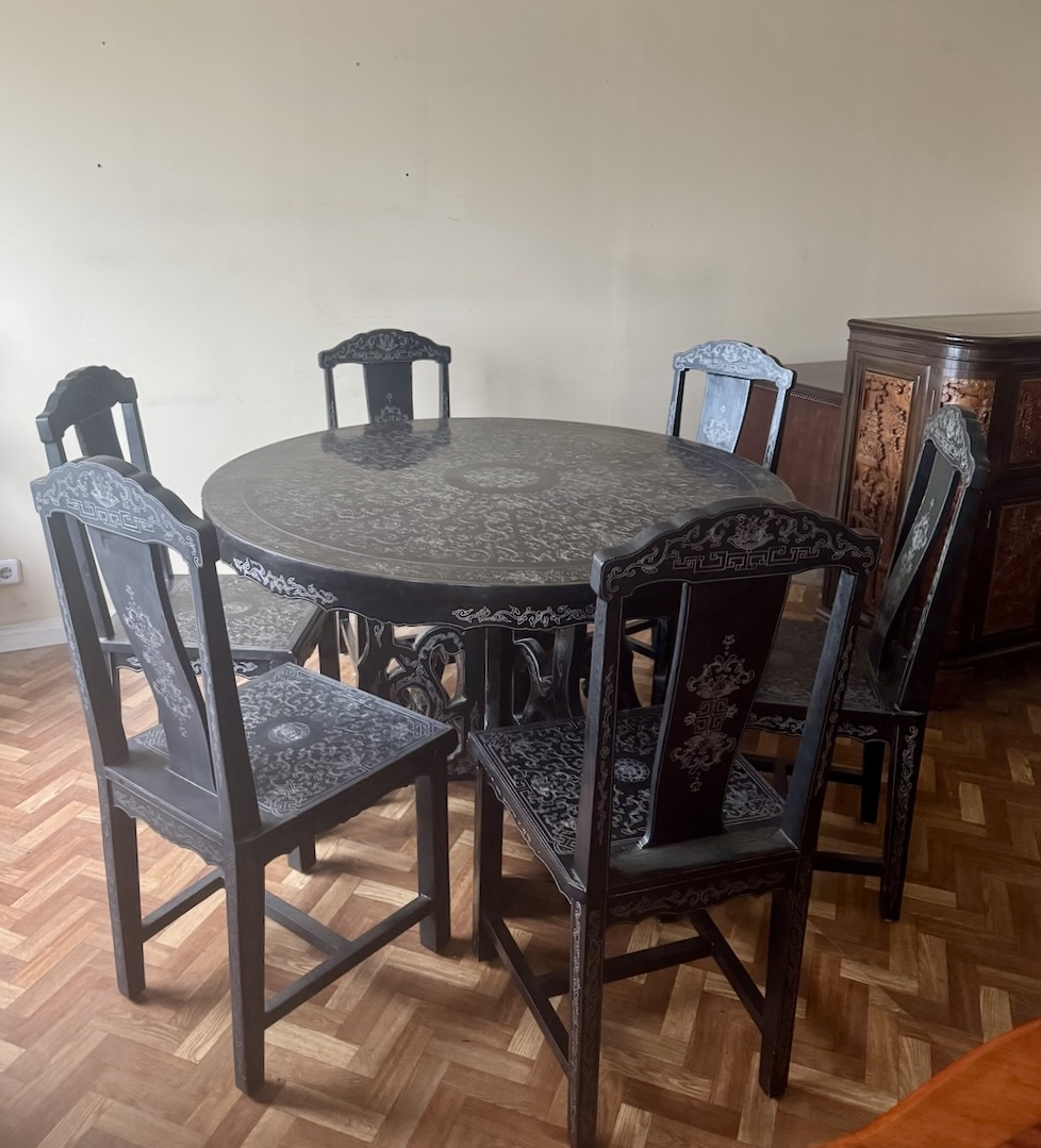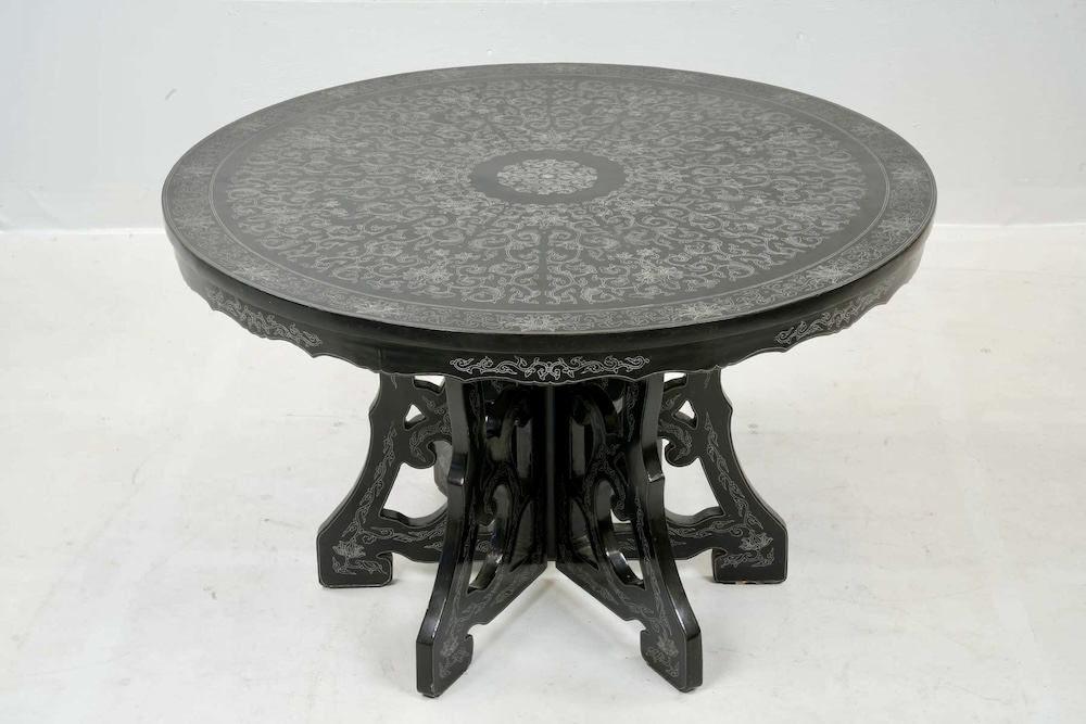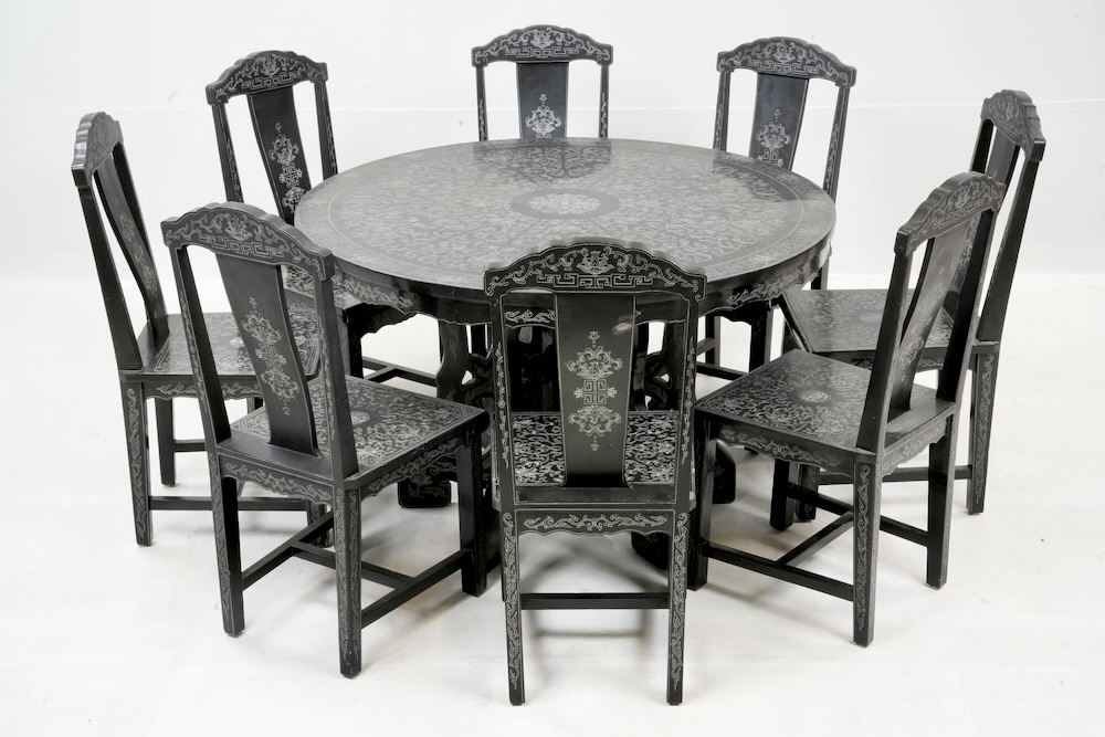 Уникальный лакированный обеденный стол со стульями с замысловатым серебряным узором в китайским стиле Шинуазри 1950 годов с этикеткой Jinlong (Золотой Дракон) . Высота стола 78 см, ширина 125 см. Стол состоит из двух частей: круглой поверхности и опоры. Можно приобрести в комплекте стол и 4 стула, стол и 6 стульев или стол и 8 стульев. Цена указана за комплект из стола и 4 стульев.