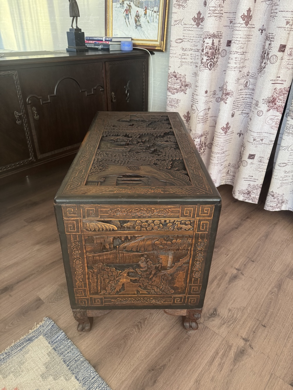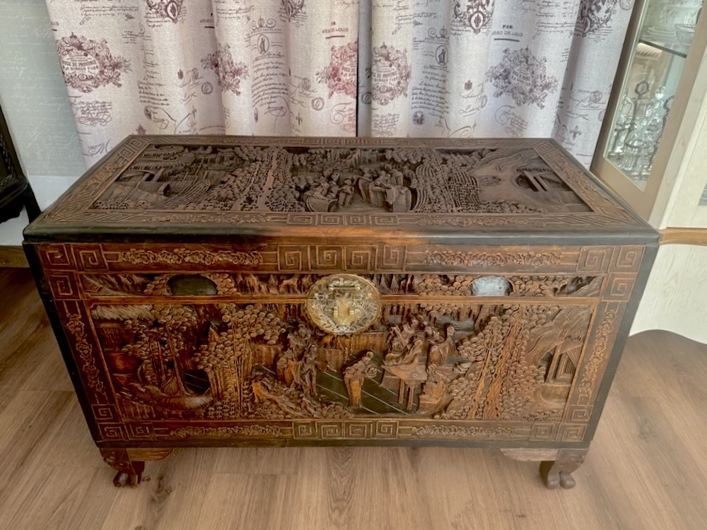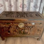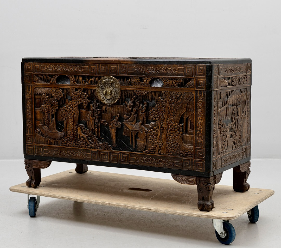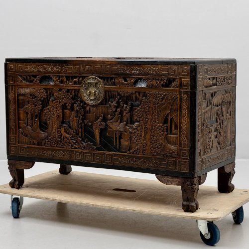Антикварный китайский резной деревянный сундук из камфорного дерева, начало XX века., полностью ручная работа, массив, резная отделка с изображением садовых сцен, цветочных гирлянд и бордюра. Изготовленный из камфорного дерева, известного своей прочностью и устойчивостью к вредителям, он не только отличается потрясающим мастерством, но и сохраняет свои природные ароматические свойства. Детальная резьба с традиционными китайскими мотивами несомненно добавит изысканность и оригинальность в интерьер