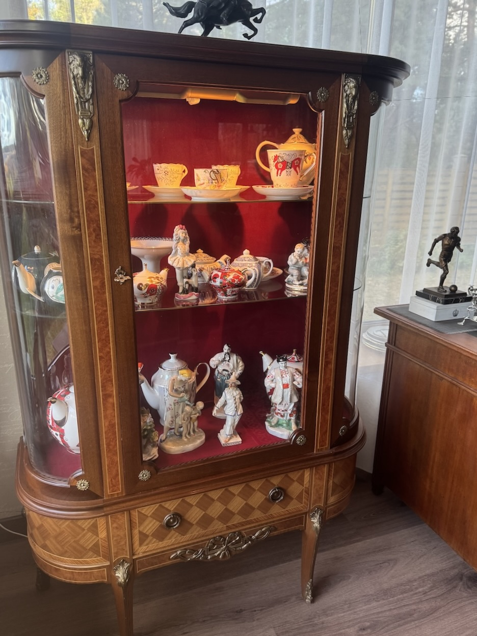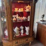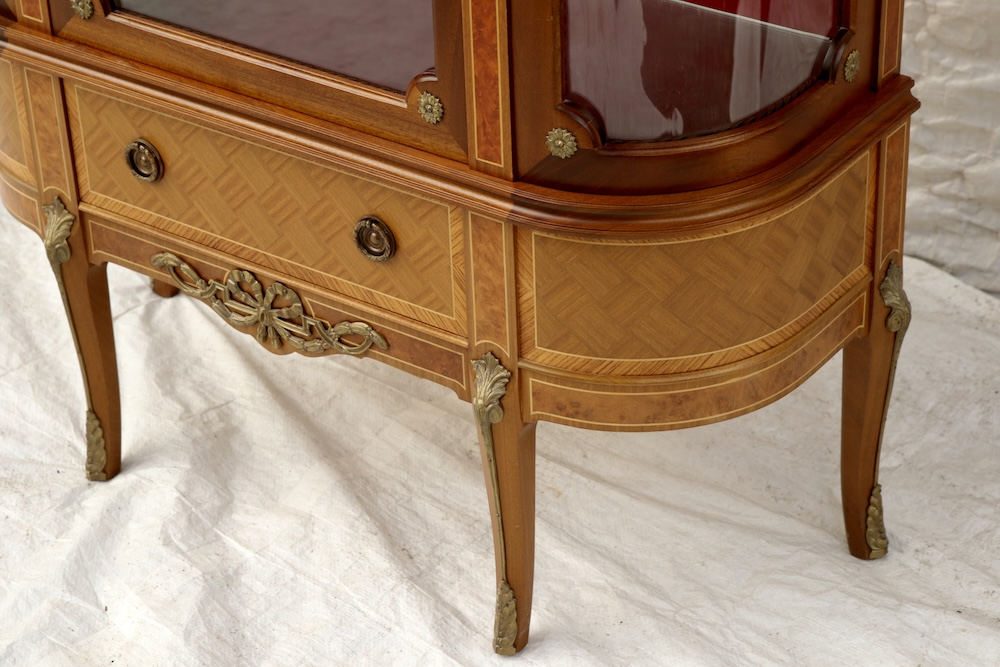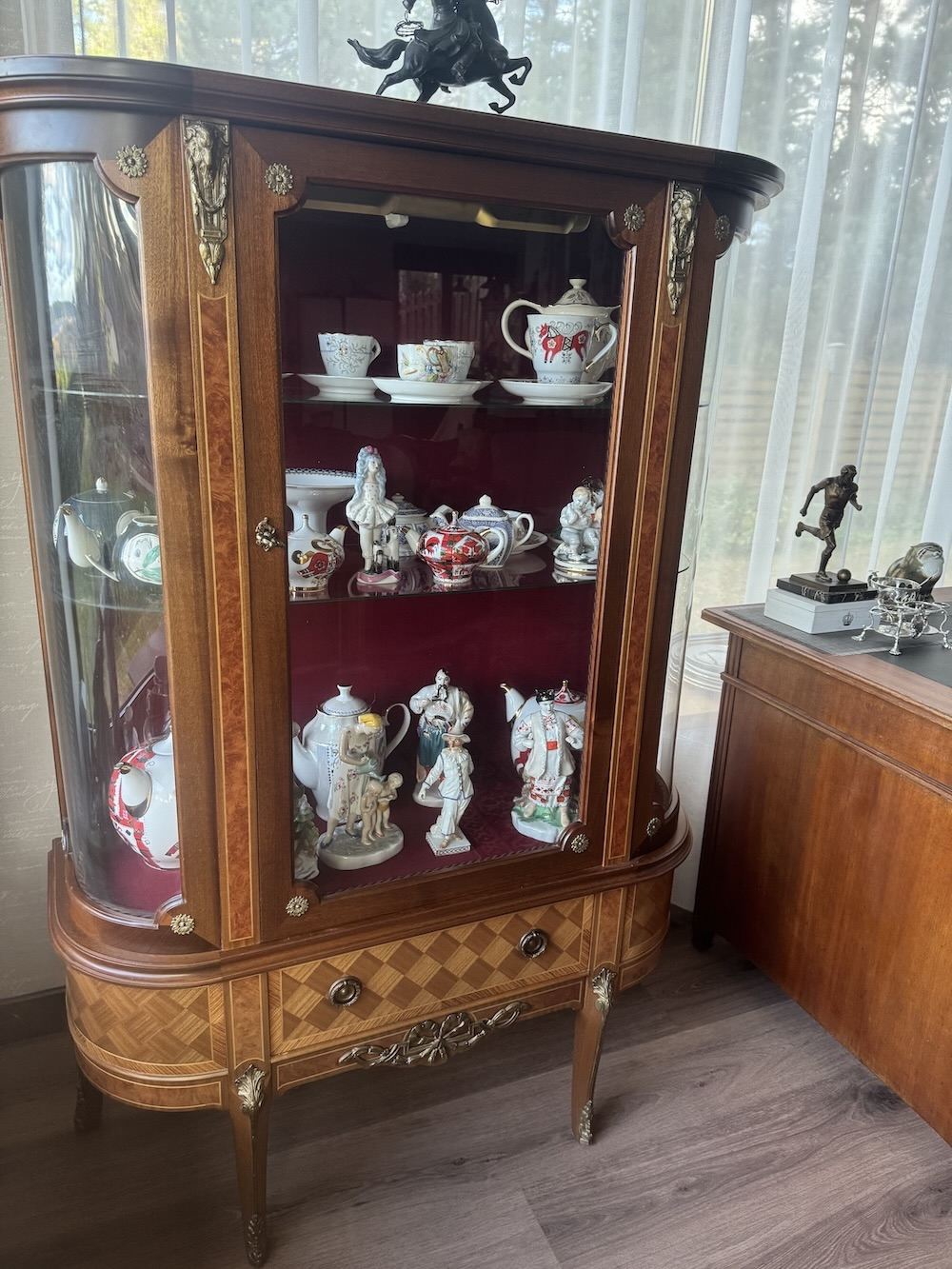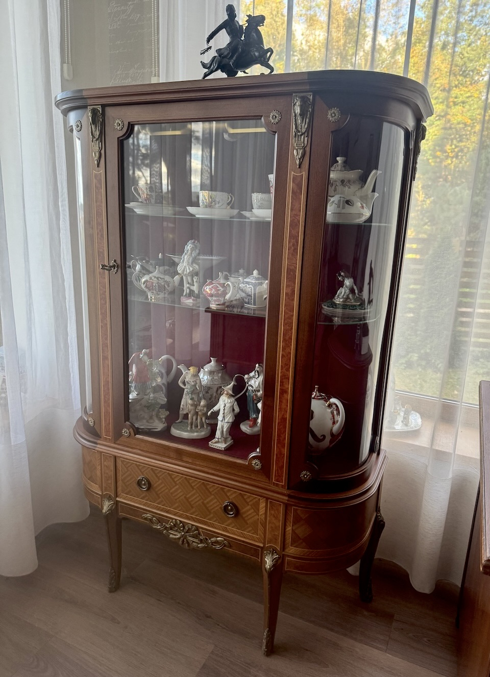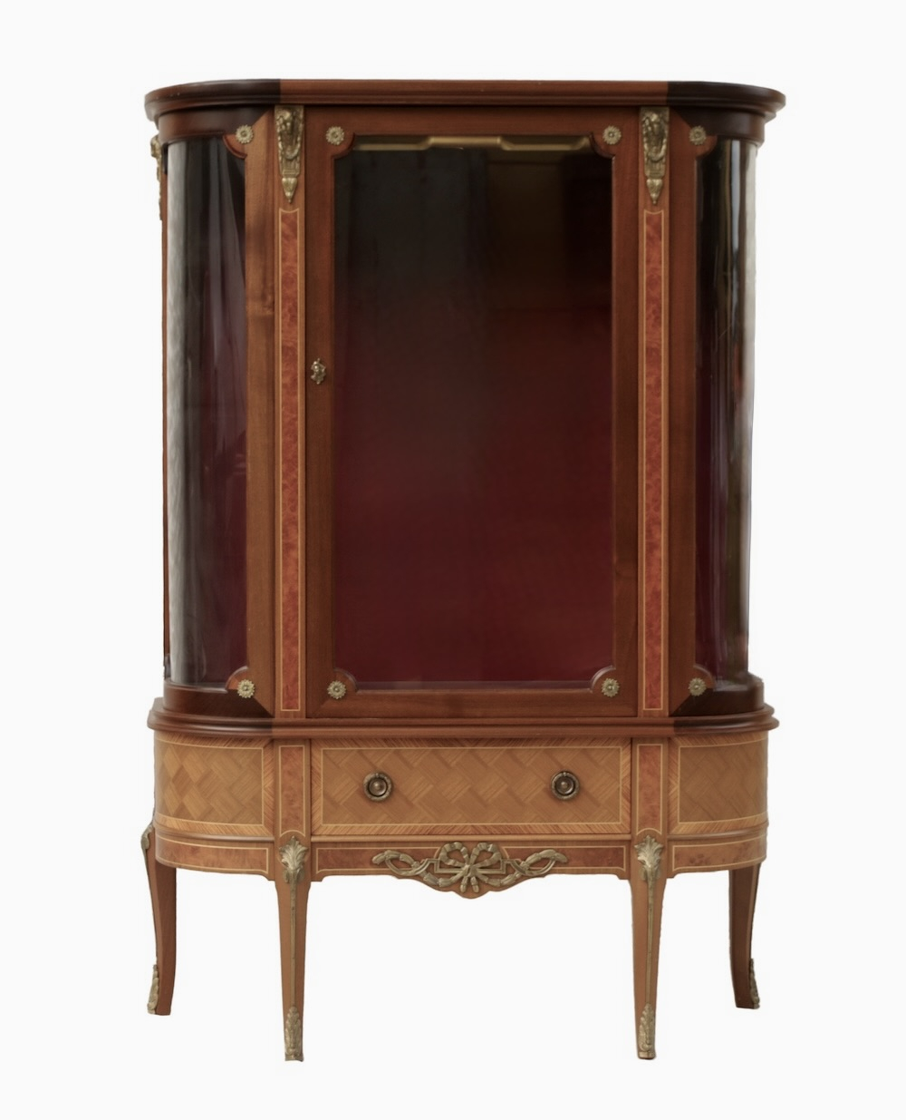 Великолепная элегантная витрина в стиле Людовика XVI, декор маркетри с красивым рисунком, ценные породы древесины, латунные накладки, сложная закругленная форма, вместительная, панорамное остекление . Одна дверца, ключ, внутри две полки, вместительный ящик, подсветка. Высота 149 см, ширина 100 см, глубина 39 см.