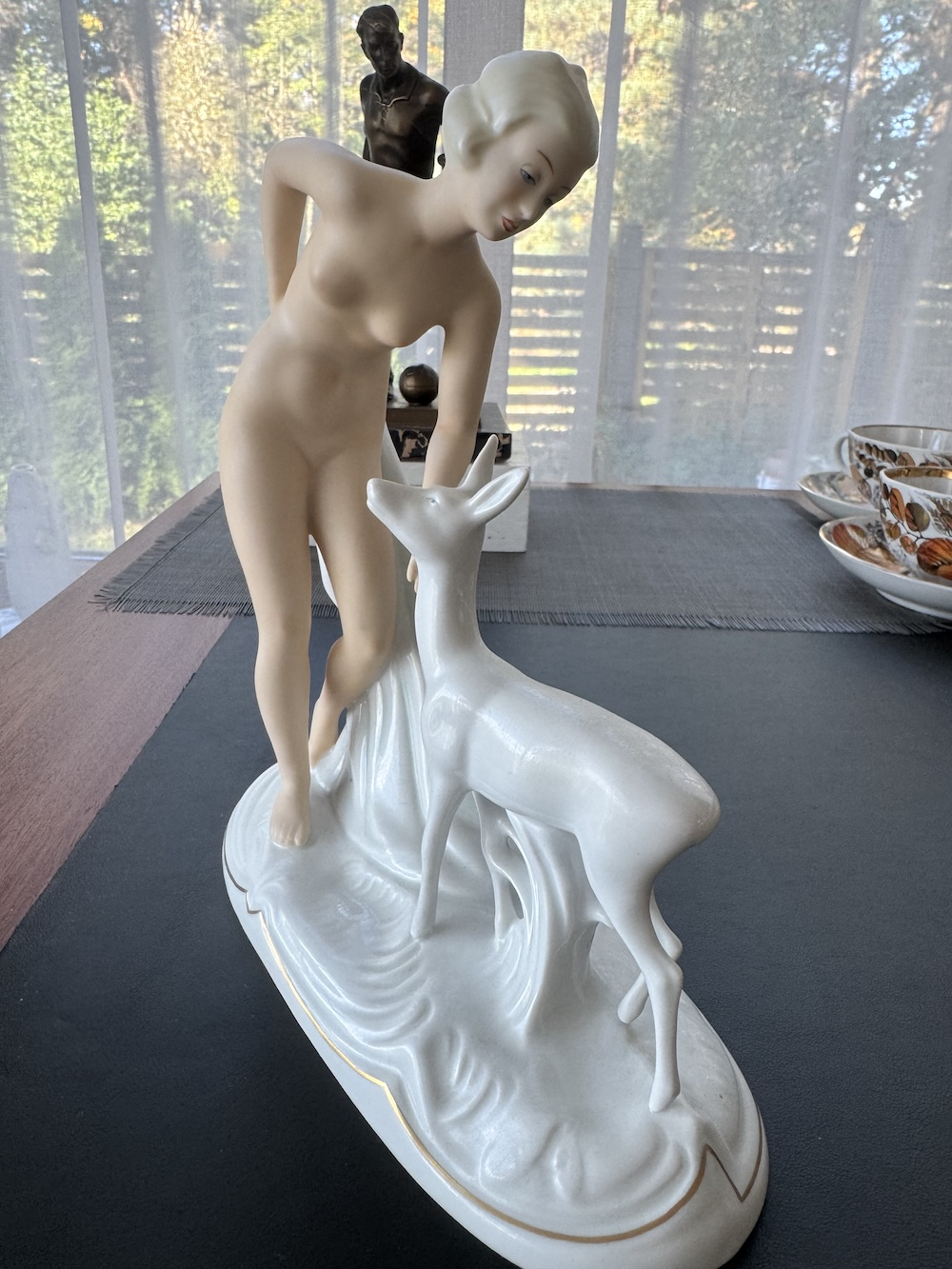 Великолепная фарфоровая статуэтка немецкой фабрики Schaubach Kunst /Germany середины 1900-х годов (клеймо 1953-1958 года),изображающая обнаженную девушку c олененком в стиле Ар-деко, без сколов и реставрации.Высота 21 см. Прекрасно и для подарка, и для коллекции.