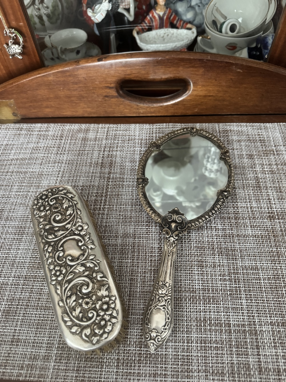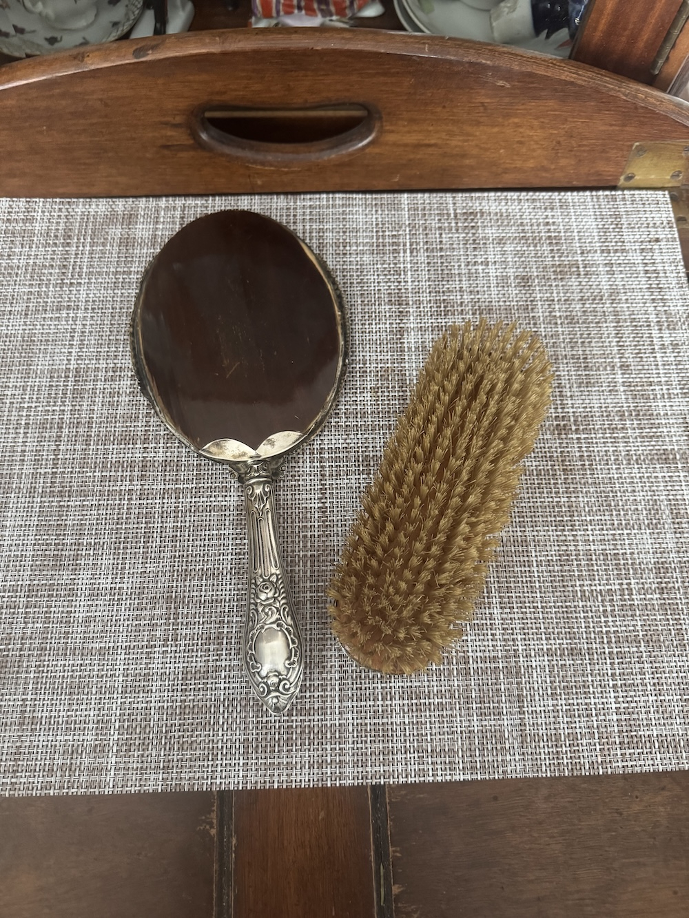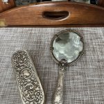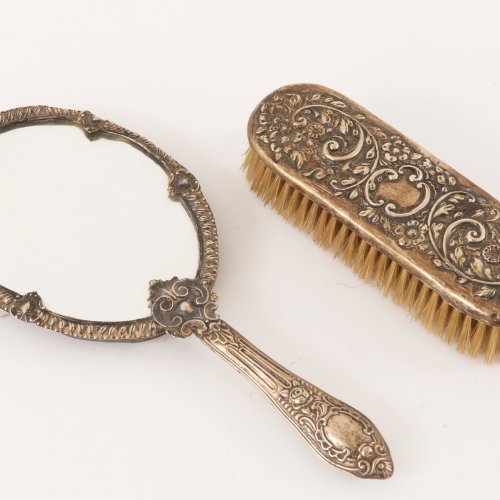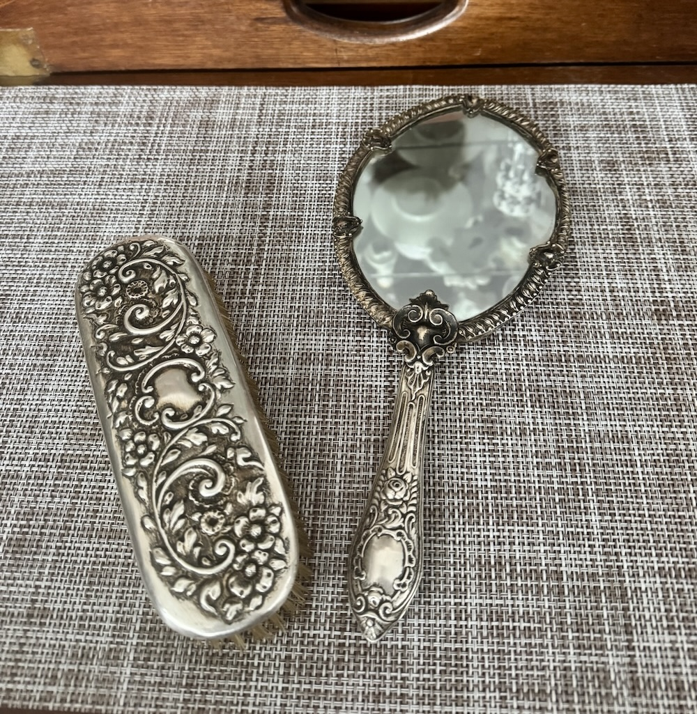Комплект из антикварных предметов обихода в виде ручного зеркала и щетки, с замысловатым рельефным декором, изготовленный из стерлингового серебра 925 пробы, Англия. Размер : Длина 16,5-26 см Четкое клеймо на щетке Sterling 925/1000